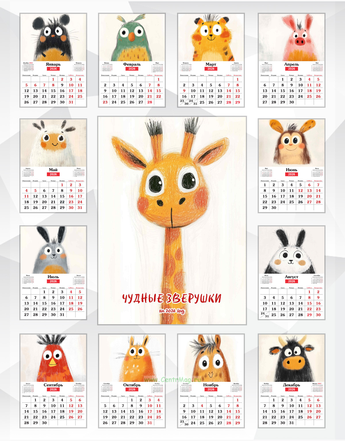 Календарь настенный, перекидной "Чудные зверушки" на 2026 год