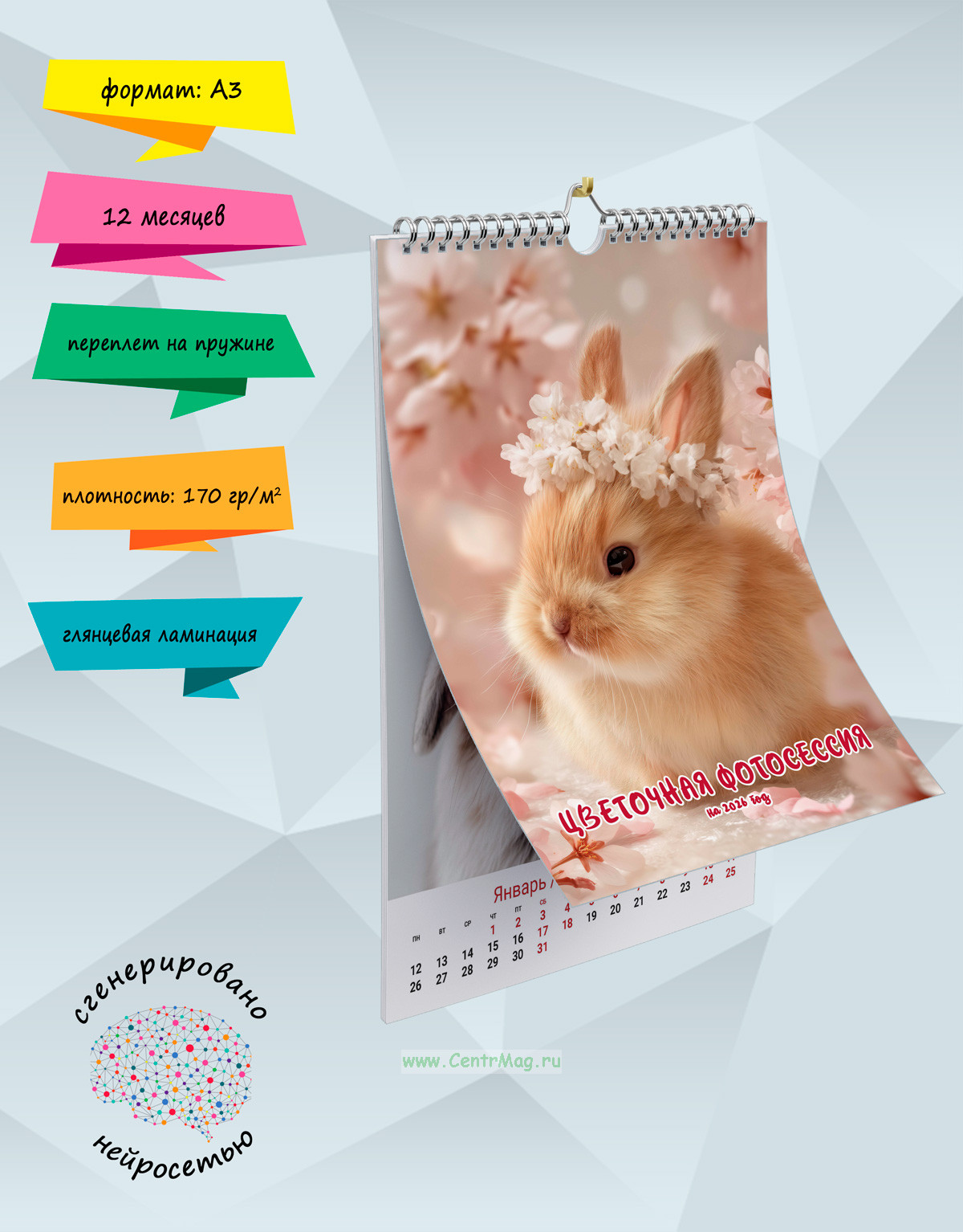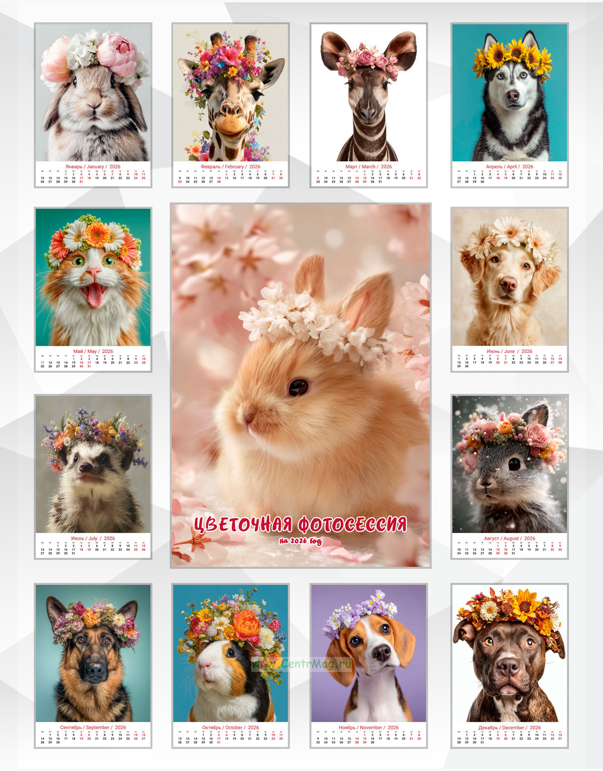 Календарь содержит изображения очаровательных зверушек в цветочных головных уборах, сгенерированные с помощью нейросети. Календарь будет отличным подарком для ваших родных, друзей, знакомых, коллег или даже для себя.