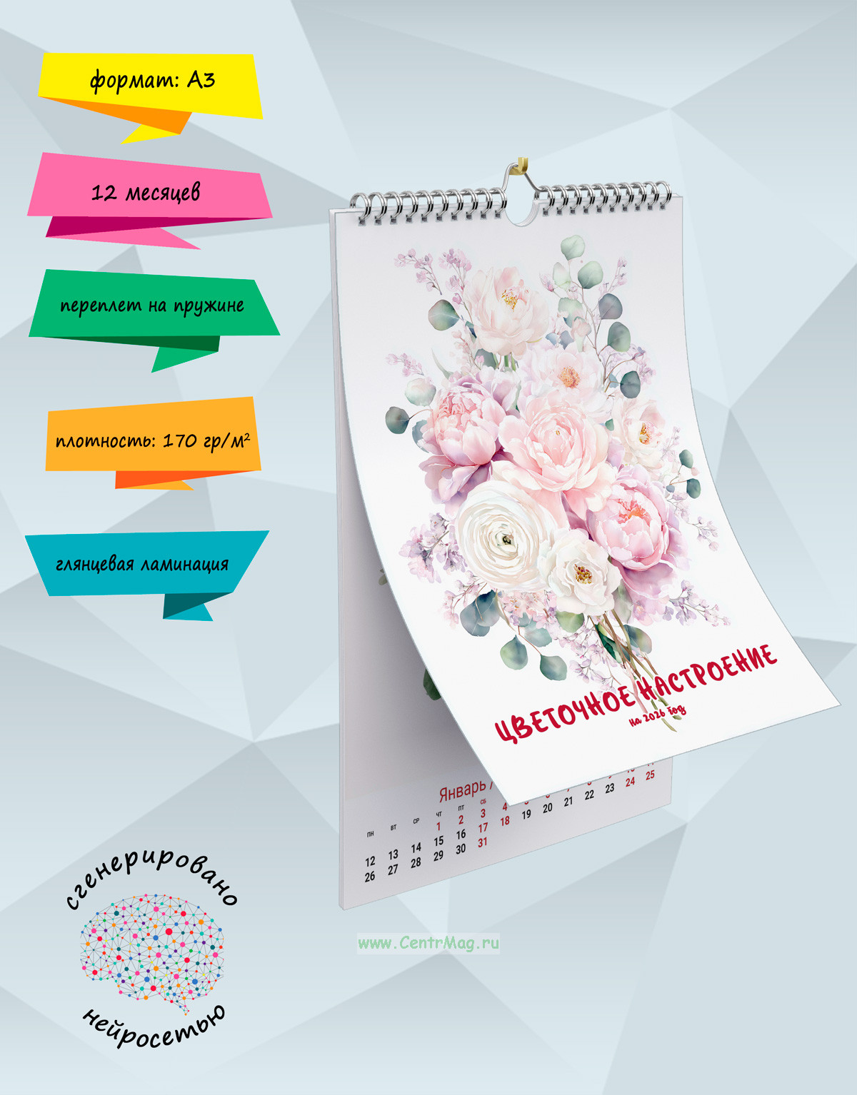 Календарь содержит изображения красивых весенних цветов, сгенерированные с помощью нейросети. Календарь будет отличным подарком для ваших родных, друзей, знакомых, коллег или даже для себя.