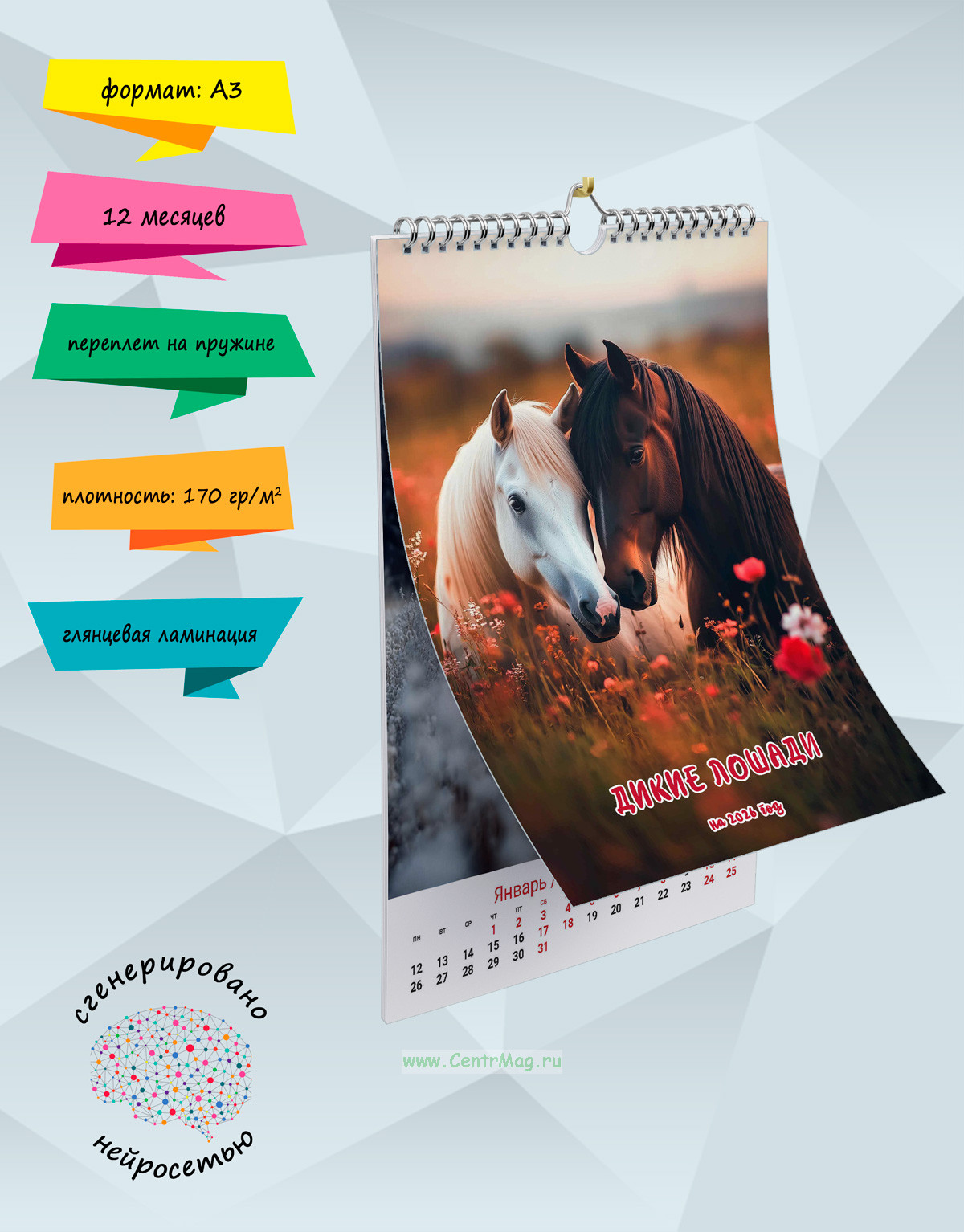 Календарь содержит великолепные изображения грациозных лошадей, сгенерированные с помощью нейросети, которые вдохновляют и восхищают. Календарь будет отличным подарком для ваших родных, друзей, знакомых, коллег или даже для себя.