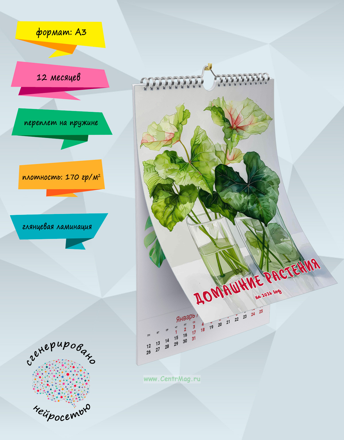 Календарь содержит изображения прекрасных зеленых домашних растений, сгенерированные с помощью нейросети, выполненных в нарисованном стиле. Календарь будет отличным подарком для ваших родных, друзей, знакомых, коллег или даже для себя.