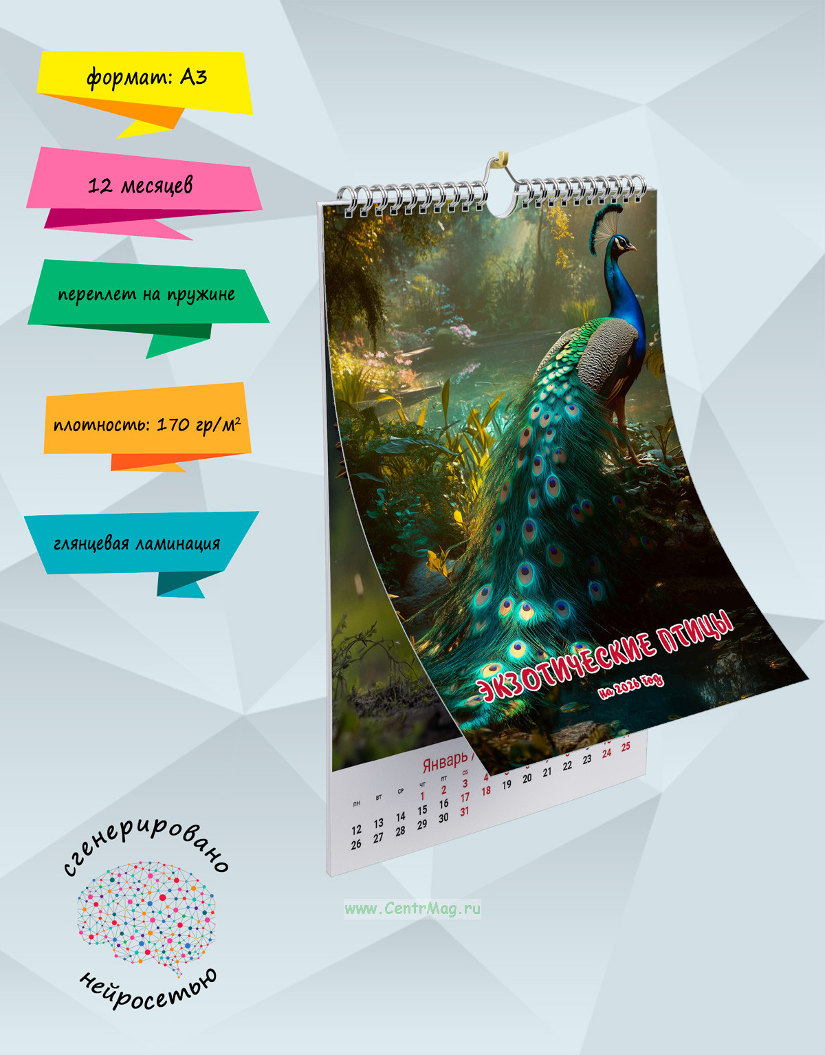 Календарь содержит изображения красивых необычных птиц, сгенерированные с помощью нейросети. Календарь будет отличным подарком для ваших родных, друзей, знакомых, коллег или даже для себя.