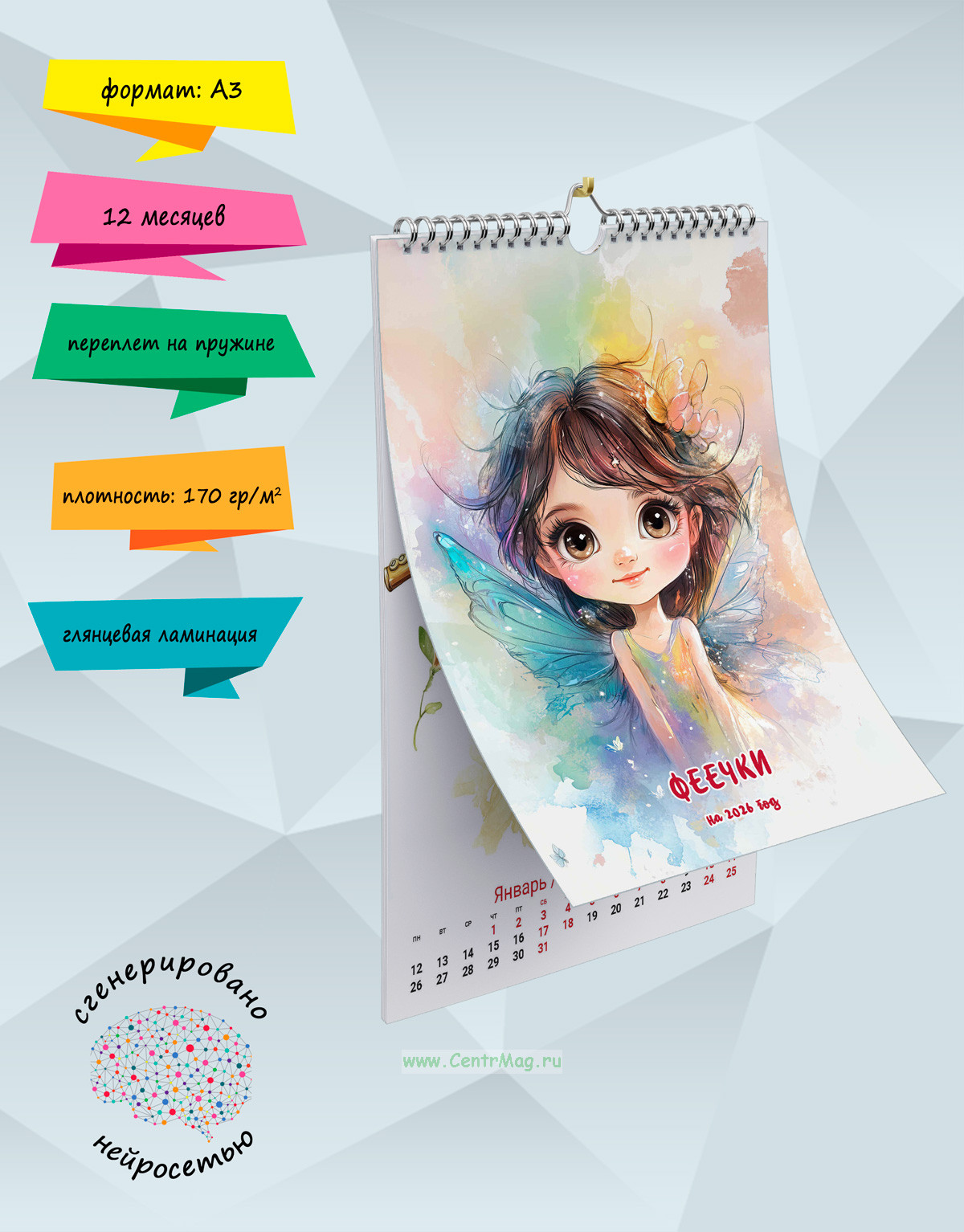 Календарь содержит милые изображения маленьких феечек, сгенерированные с помощью нейросети. Календарь будет отличным подарком для ваших родных, друзей, знакомых, коллег или даже для себя.