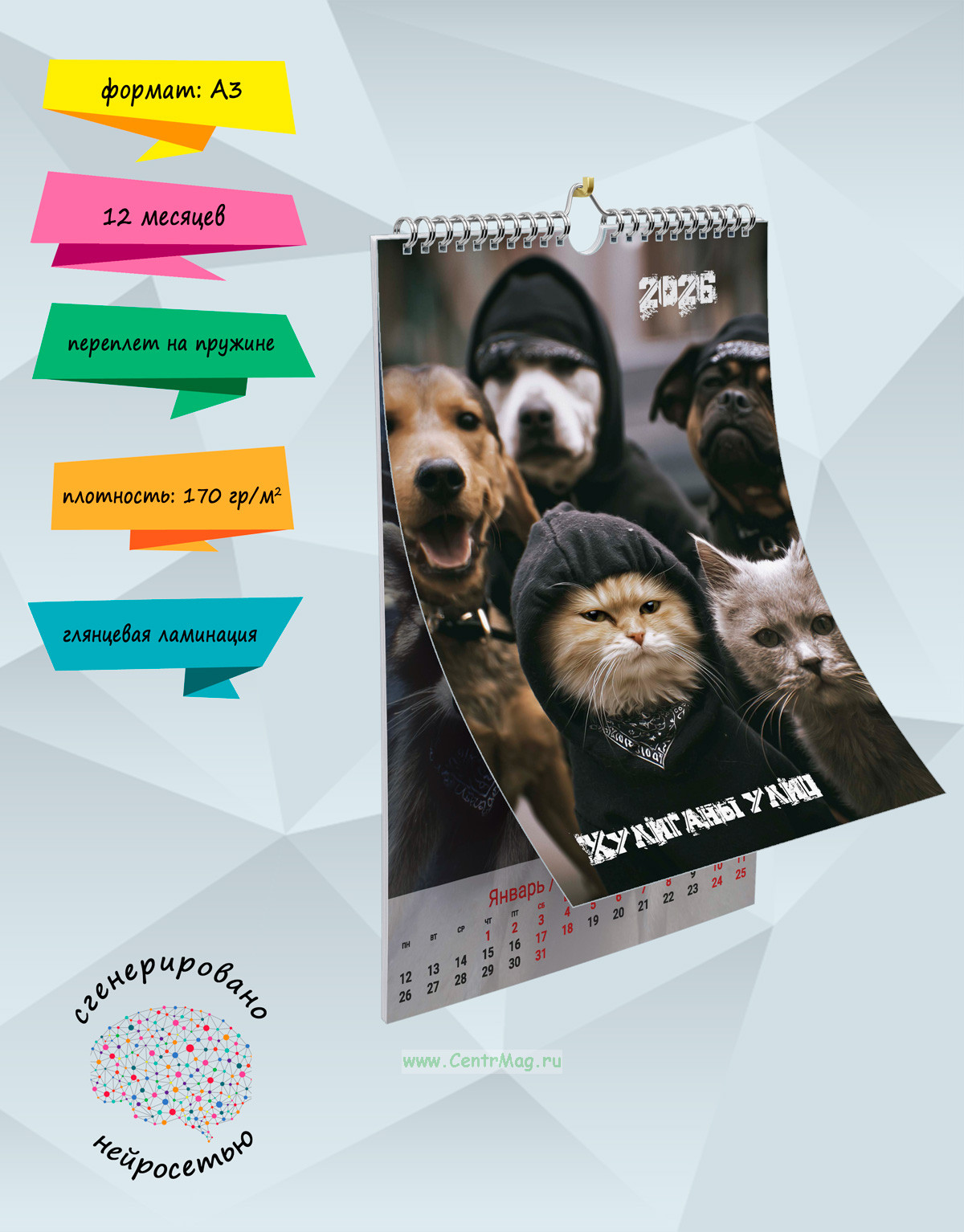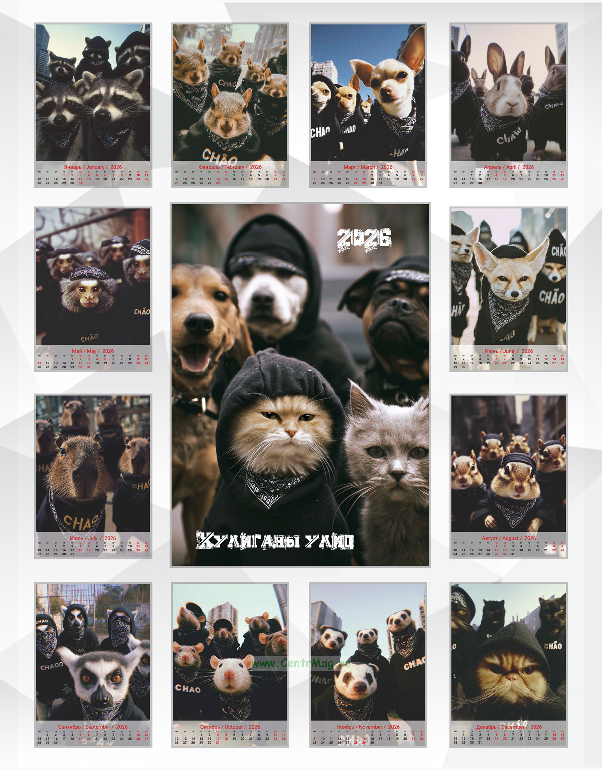 Календарь содержит изображения животных одетых в уличную одежду, что создаёт атмосферу брутальности и добавляет элемент креативности и юмора в дизайн календаря, сгенерированные с помощью нейросети. Календарь будет отличным подарком для ваших родных, друзей, знакомых, коллег или даже для себя.