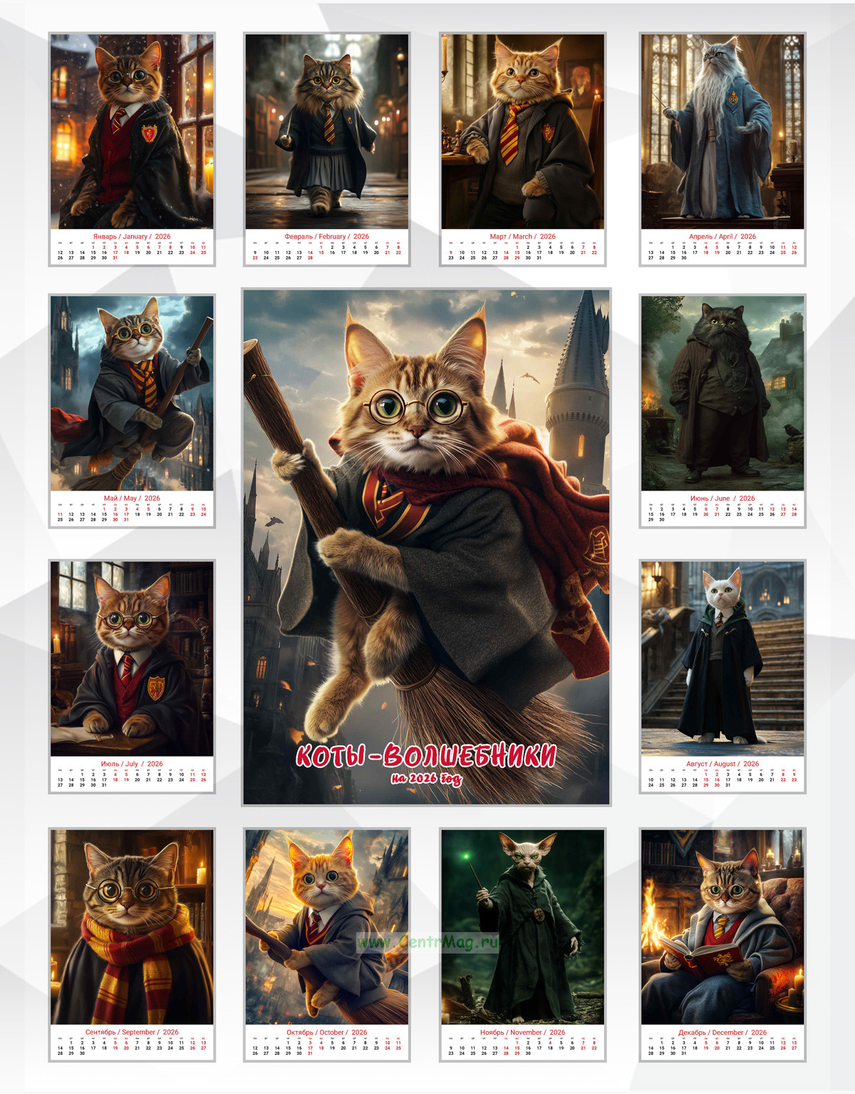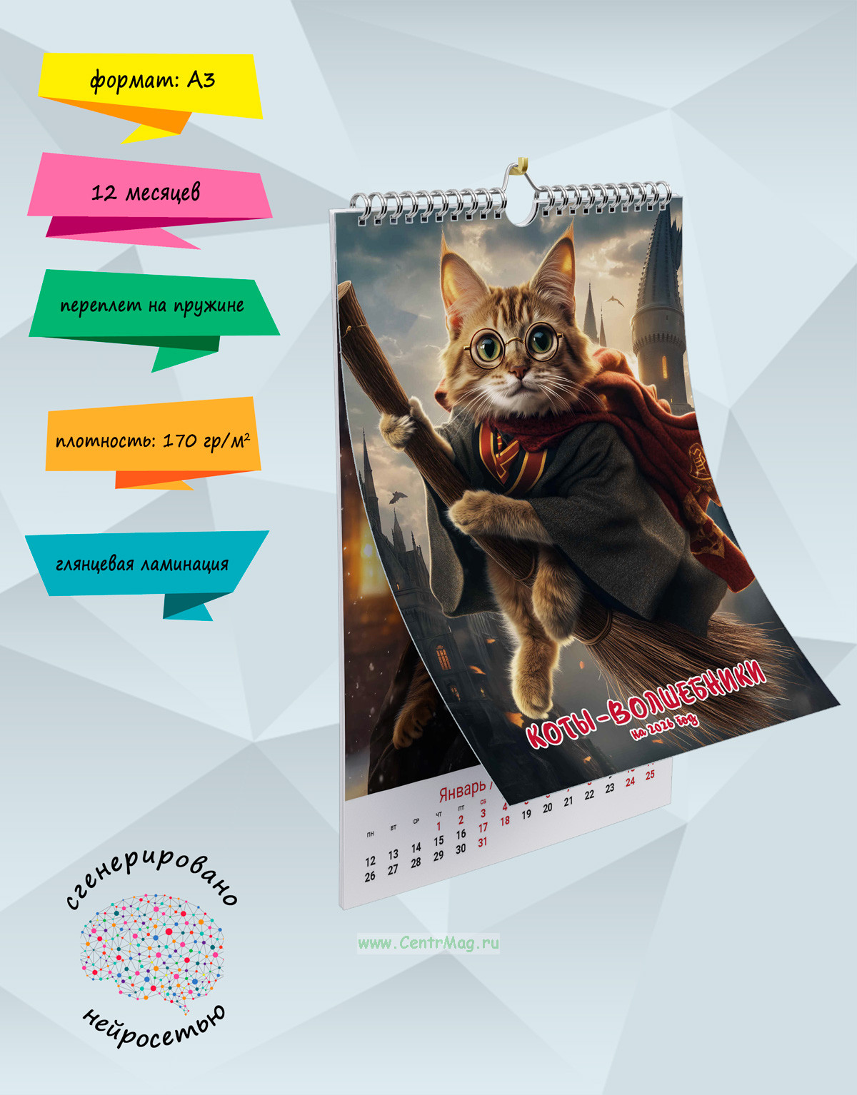 Календарь содержит изображения, которые погружают в волшебный мир, где коты становятся настоящими героями, способными на чудеса. Изображения сгенерированны с помощью нейросети. Календарь будет отличным подарком для ваших родных, друзей, знакомых, коллег или даже для себя.
