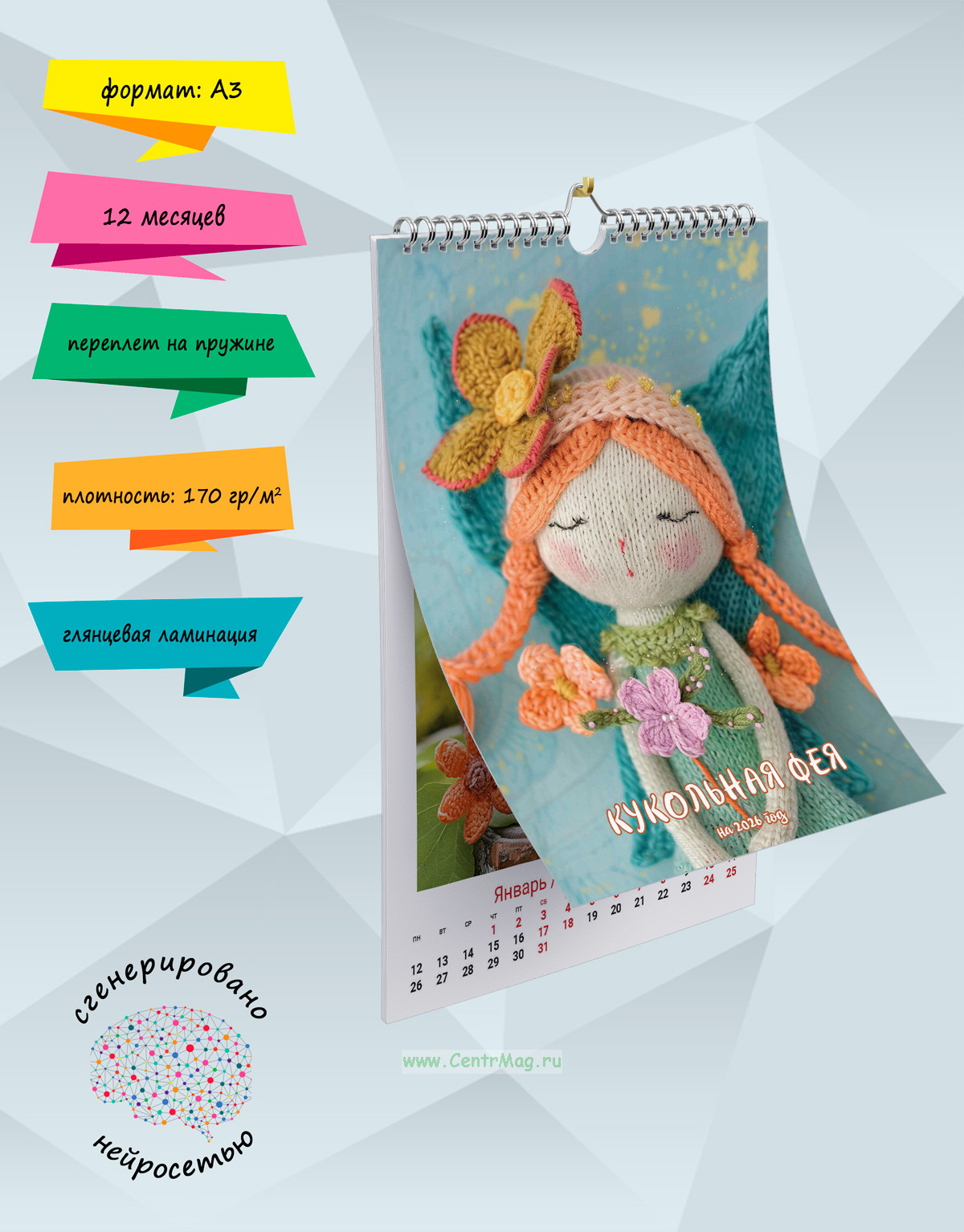 Календарь содержит изображения чудесной и волшебной феи, сгенерированные с помощью нейросети и выполненной в вязанном стиле. Календарь будет отличным подарком для ваших родных, друзей, знакомых, коллег или даже для себя.