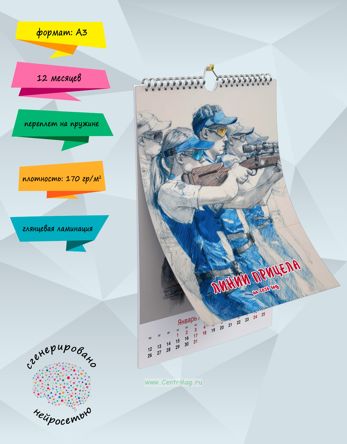 Календарь посвящён красоте и динамике стрелкового спорта, выполненный в технике карандашного рисунка, сгенерированные с помощью нейросети. Календарь будет отличным подарком для ваших родных, друзей, знакомых, коллег или даже для себя.