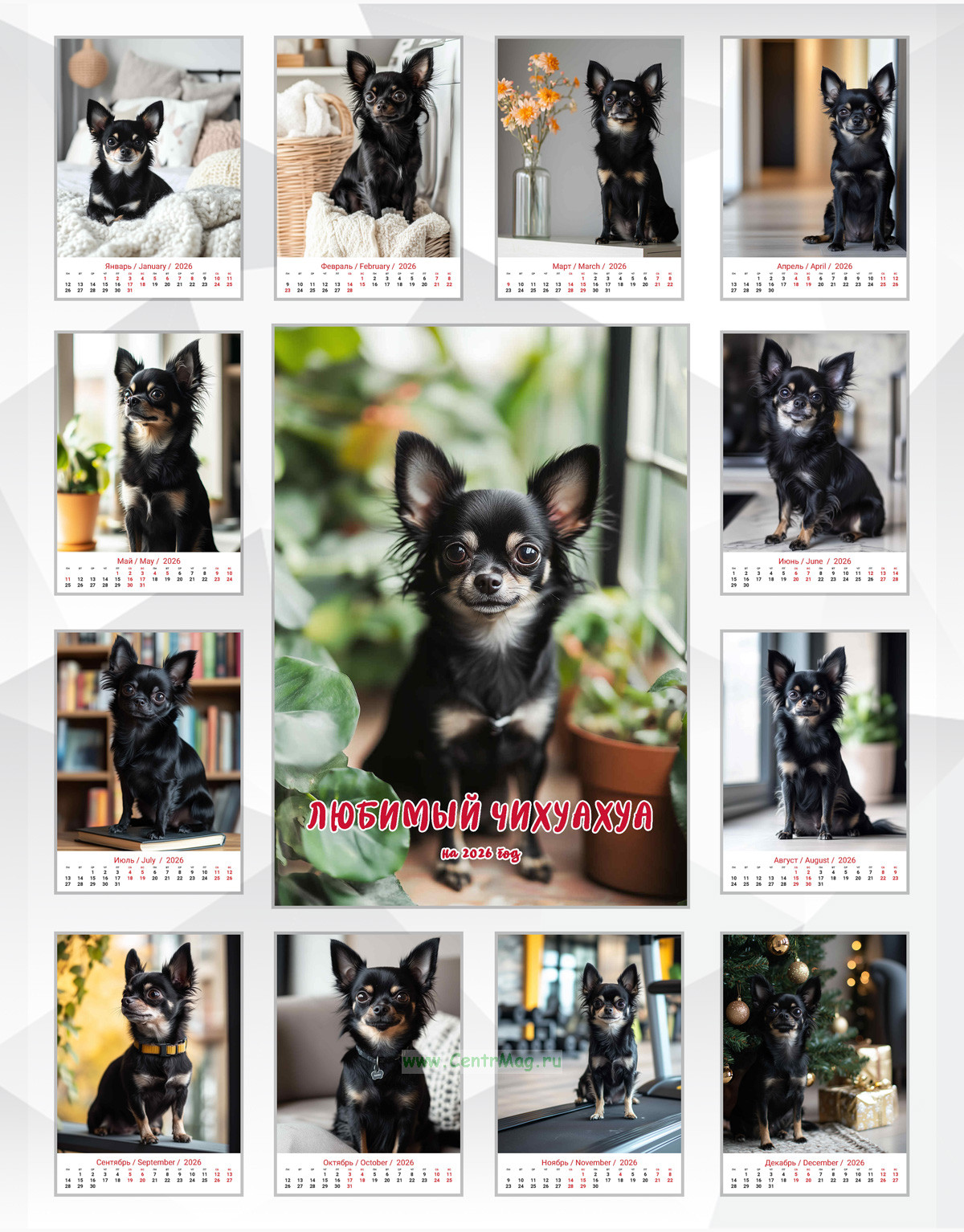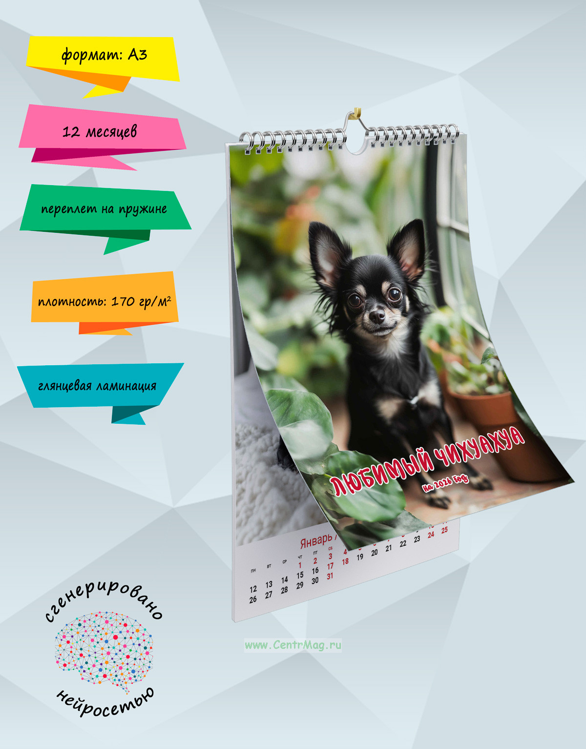 Календарь содержит изображения красивого и любимого Чихуахуа, сгенерированные с помощью нейросети. Календарь будет отличным подарком для ваших родных, друзей, знакомых, коллег или даже для себя.