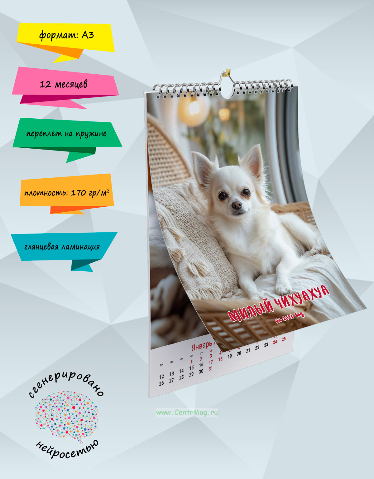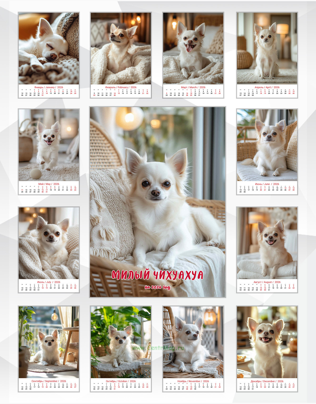 Календарь содержит изображения милого белого чихуахуа, сгенерированные с помощью нейросети, который прекрасно проводит время. Календарь будет отличным подарком для ваших родных, друзей, знакомых, коллег или даже для себя..