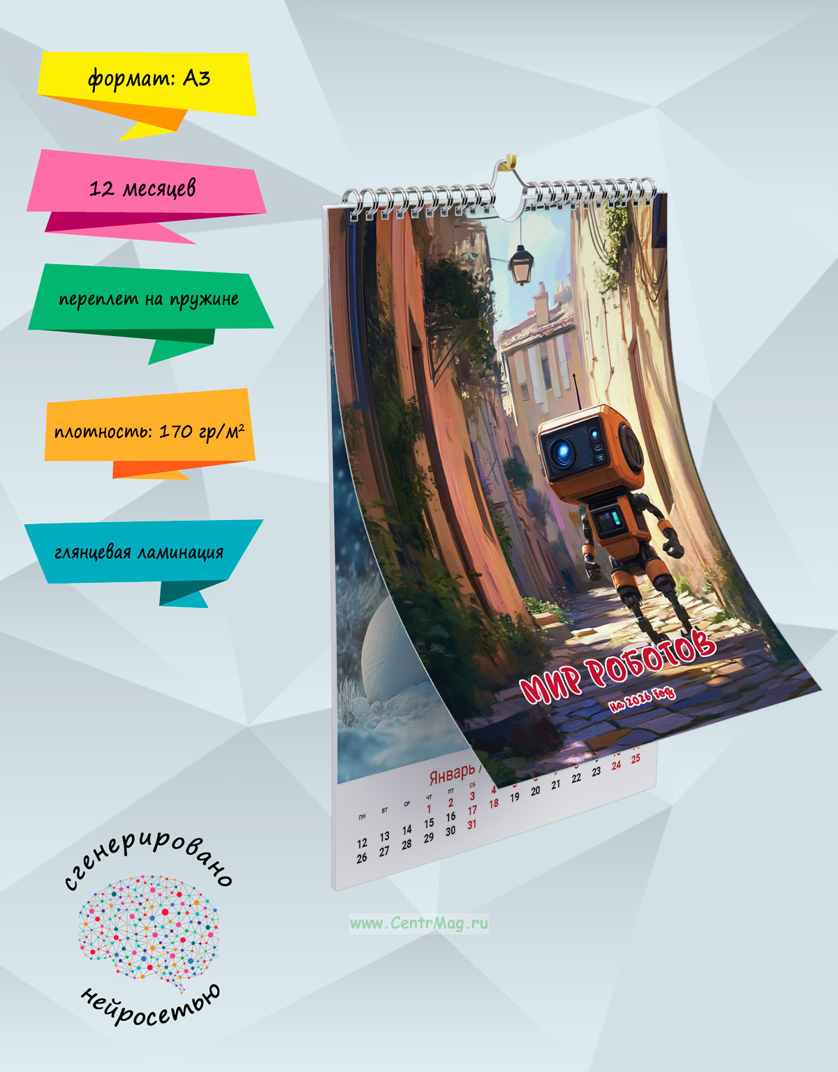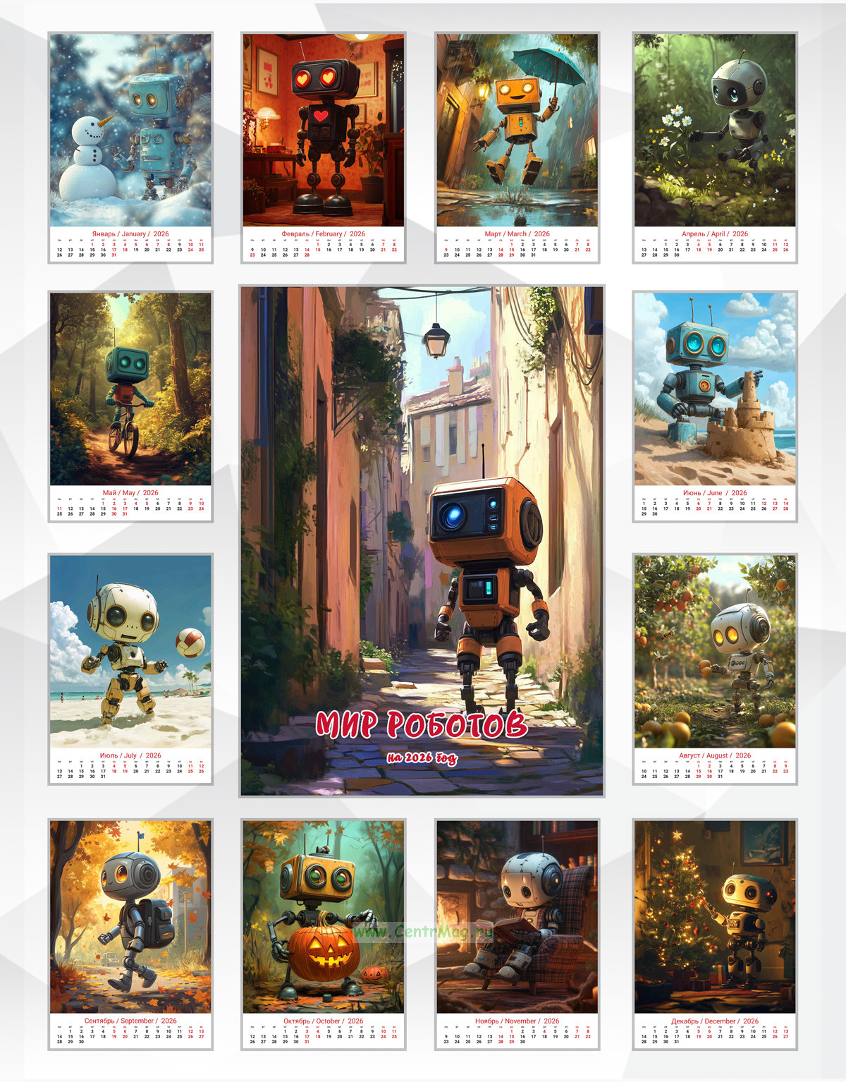 Календарь содержит изображения милого робота, сгенерированные с помощью нейросети, который весело проводит время. Календарь будет отличным подарком для ваших родных, друзей, знакомых, коллег или даже для себя.