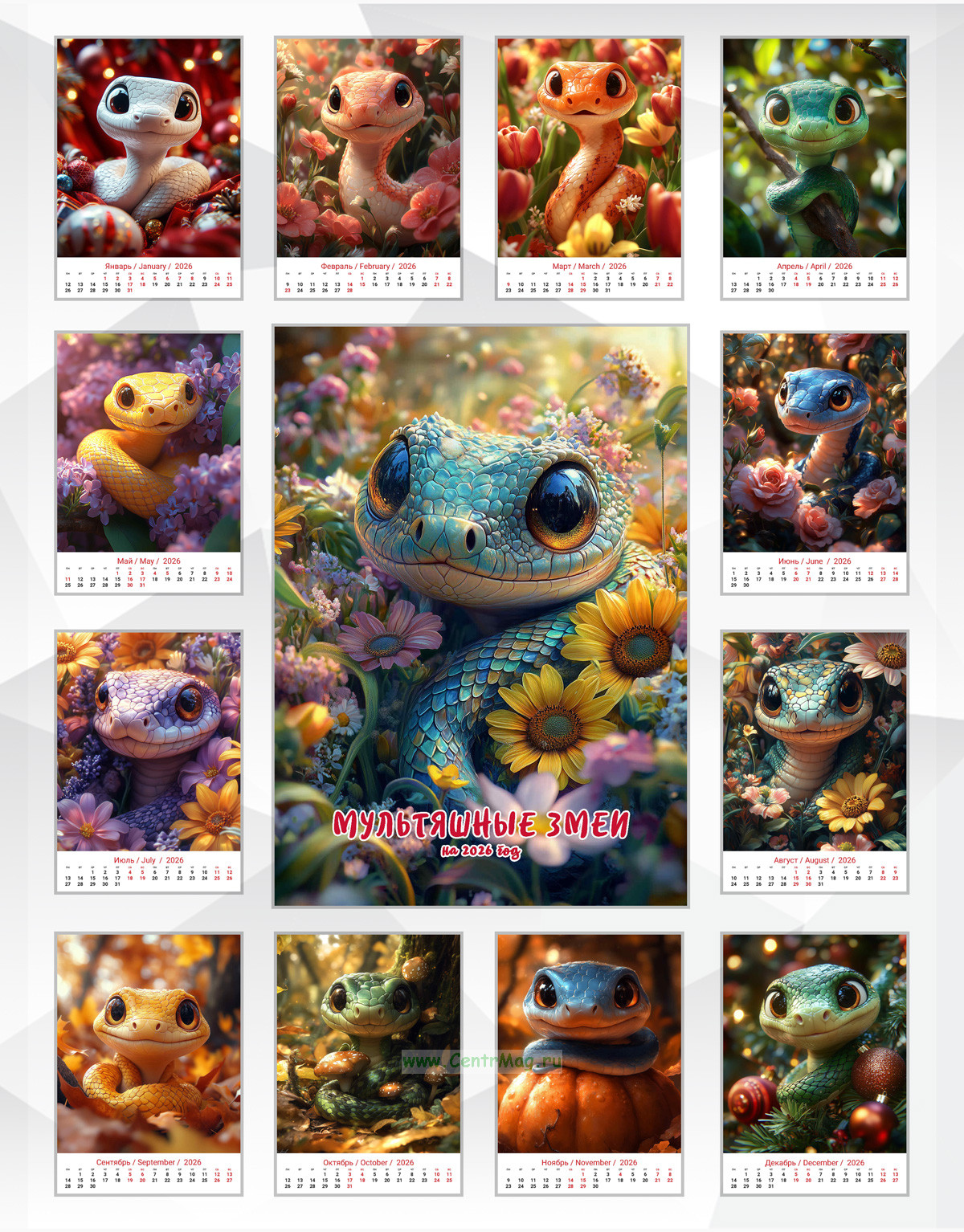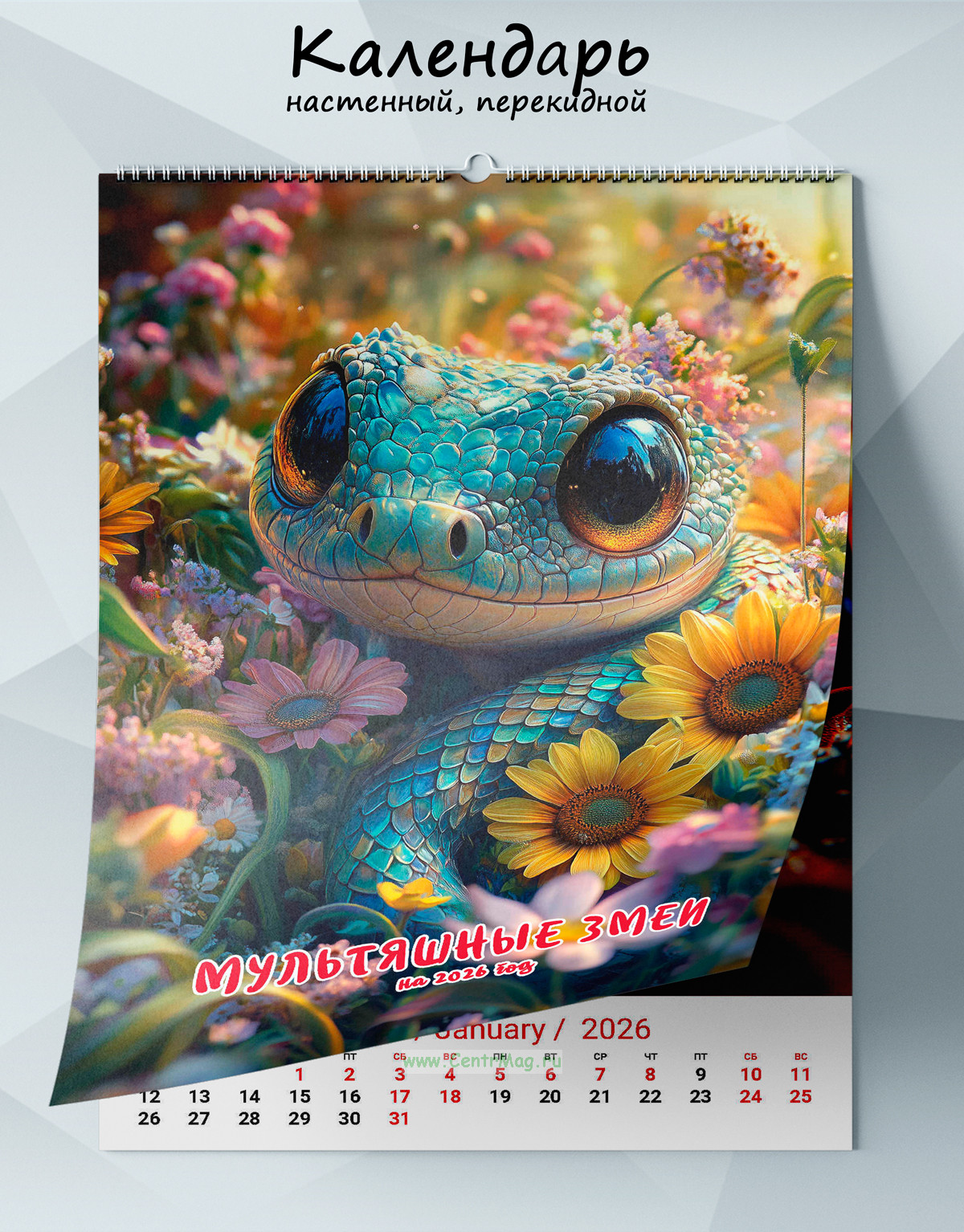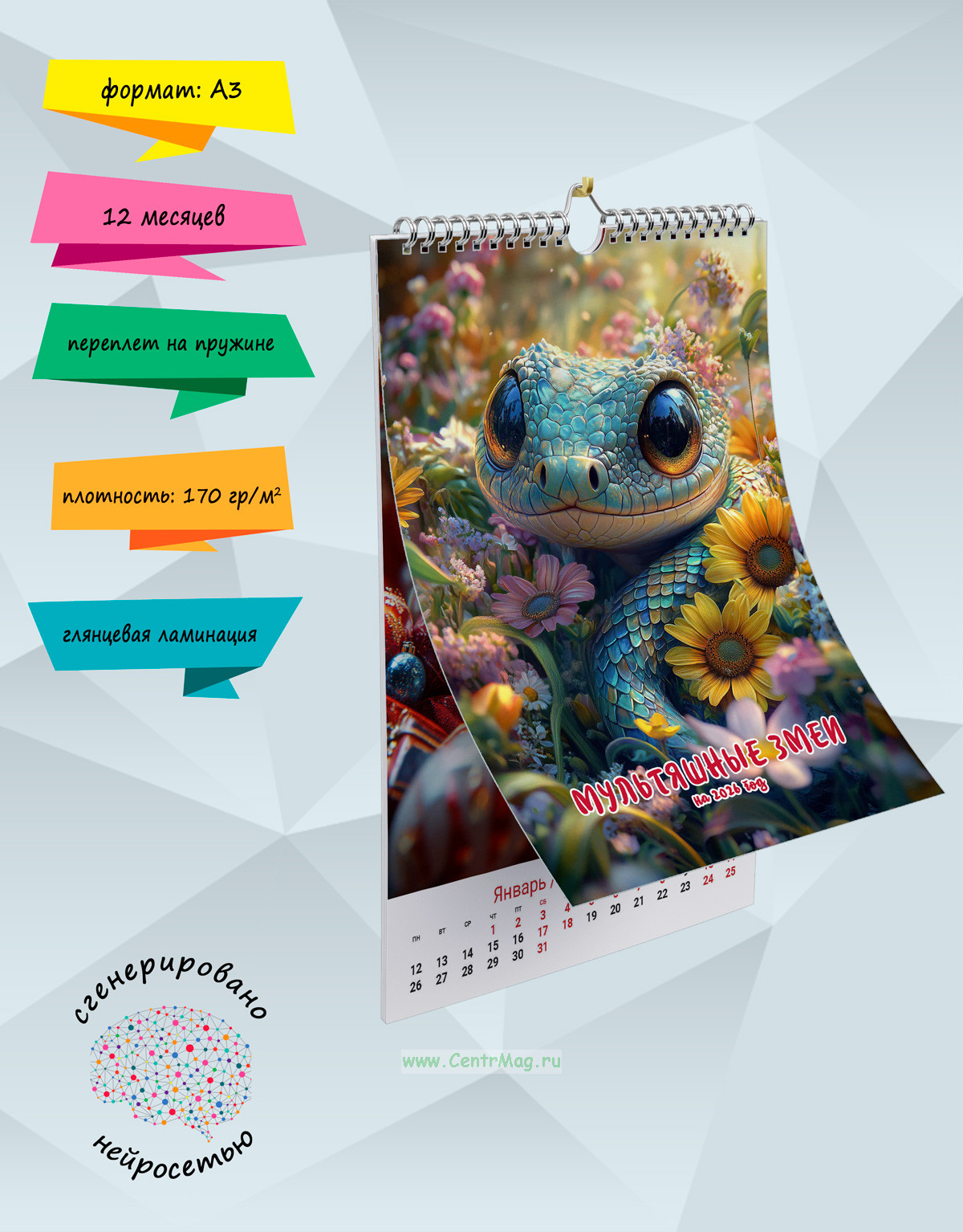 Календарь содержит изображения очаровательных мультяшных змеек, сгенерированные с помощью нейросети. Календарь будет отличным подарком для ваших родных, друзей, знакомых, коллег или даже для себя.