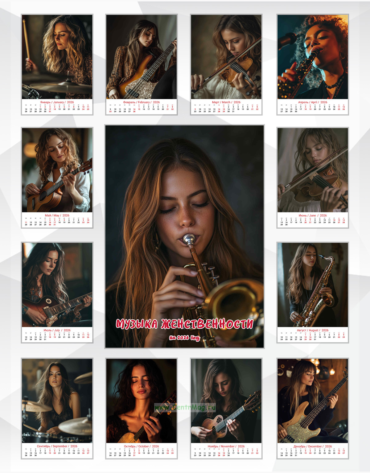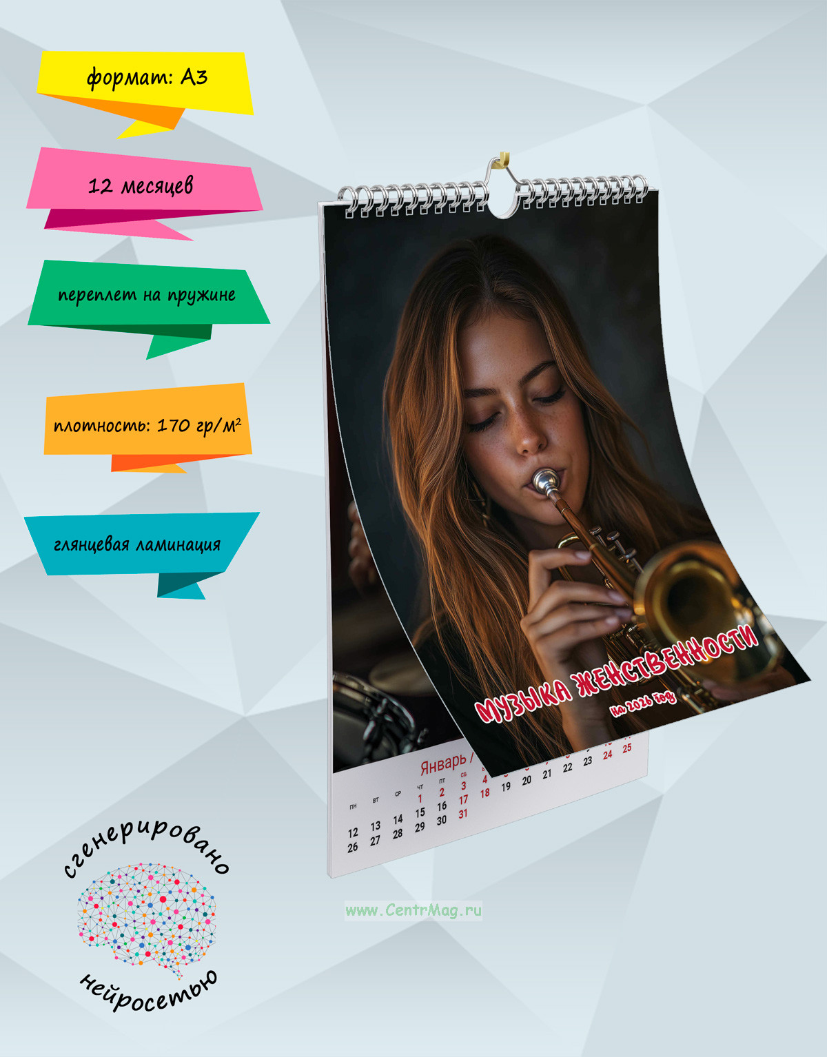 Календарь содержит изображения прекрасных девушек, сгенерированные с помощью нейросети, которые передают атмосферу игры на музыкальном инструменте. Календарь будет отличным подарком для ваших родных, друзей, знакомых, коллег или даже для себя.
