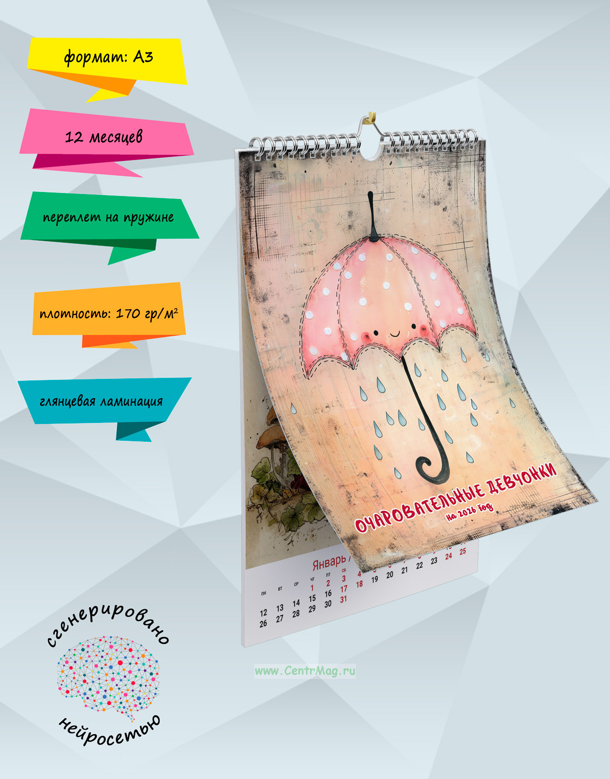 Календарь содержит акварельные изображения милых девочек, сгенерированные с помощью нейросети. Календарь будет отличным подарком для ваших родных, друзей, знакомых, коллег или даже для себя.