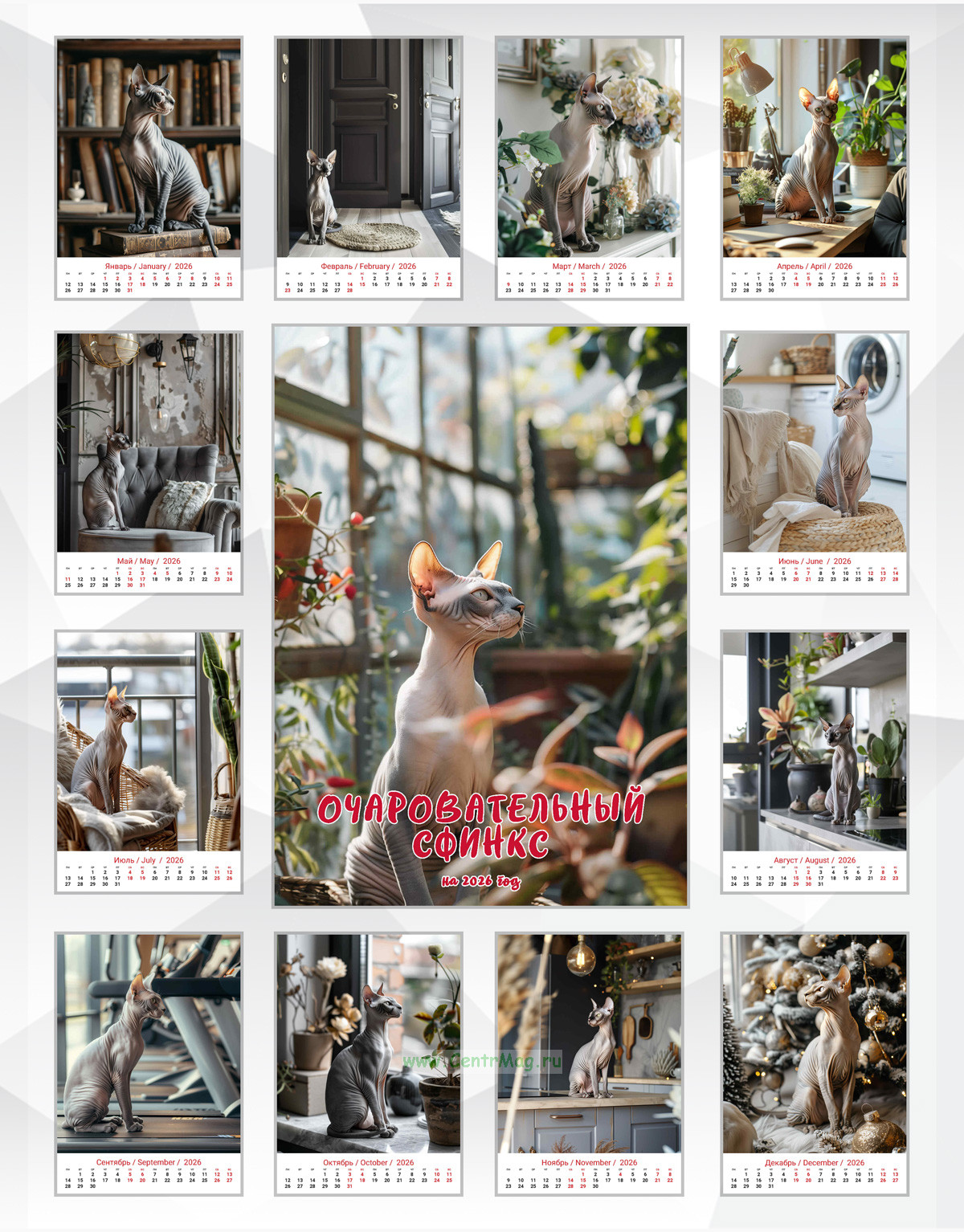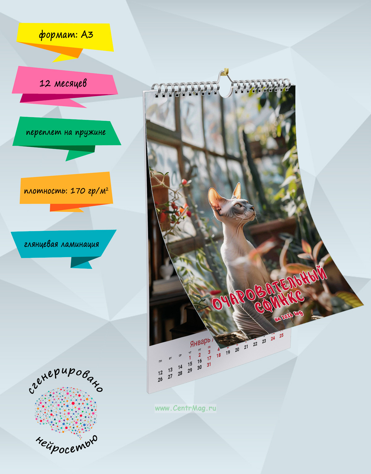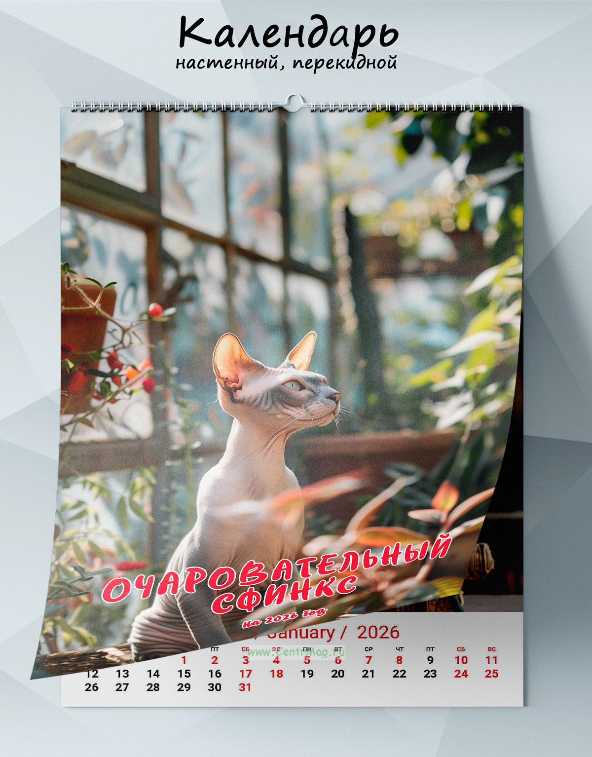Календарь содержит изображения кошки породы Сфинкс, которая очаровывает своим космическим видом, сгенерированные с помощью нейросети. Календарь будет отличным подарком для ваших родных, друзей, знакомых, коллег или даже для себя.