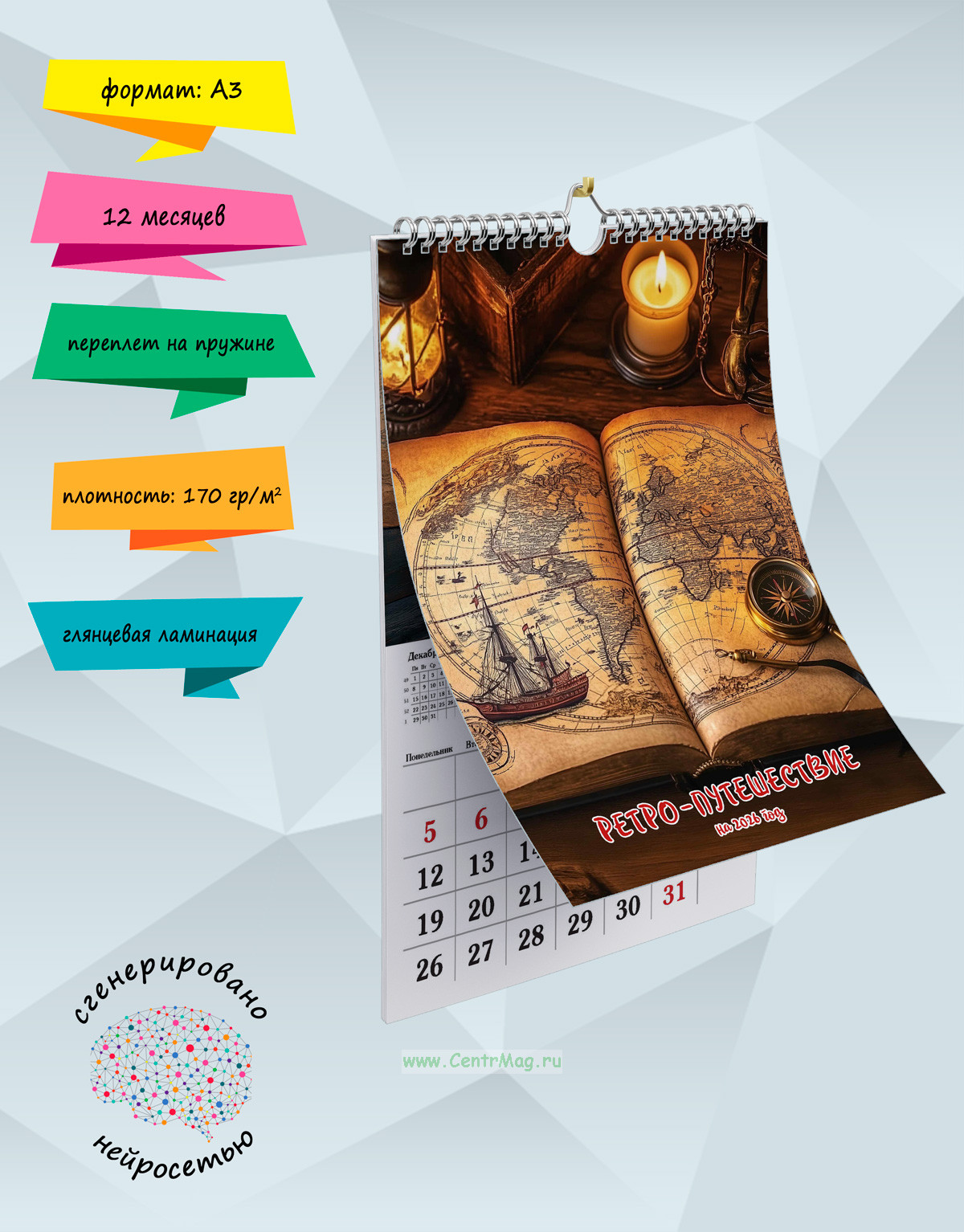 Календарь содержит изображения интересных предметов с разных путешествий, сгенерированные с помощью нейросети. Календарь будет отличным подарком для ваших родных, друзей, знакомых, коллег или даже для себя.
