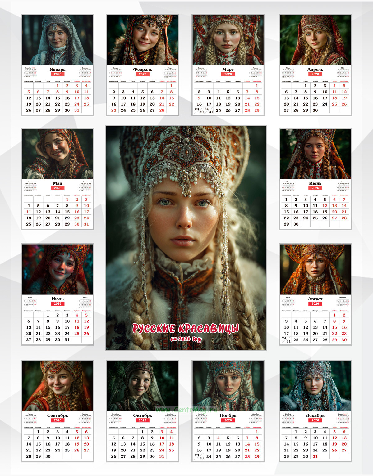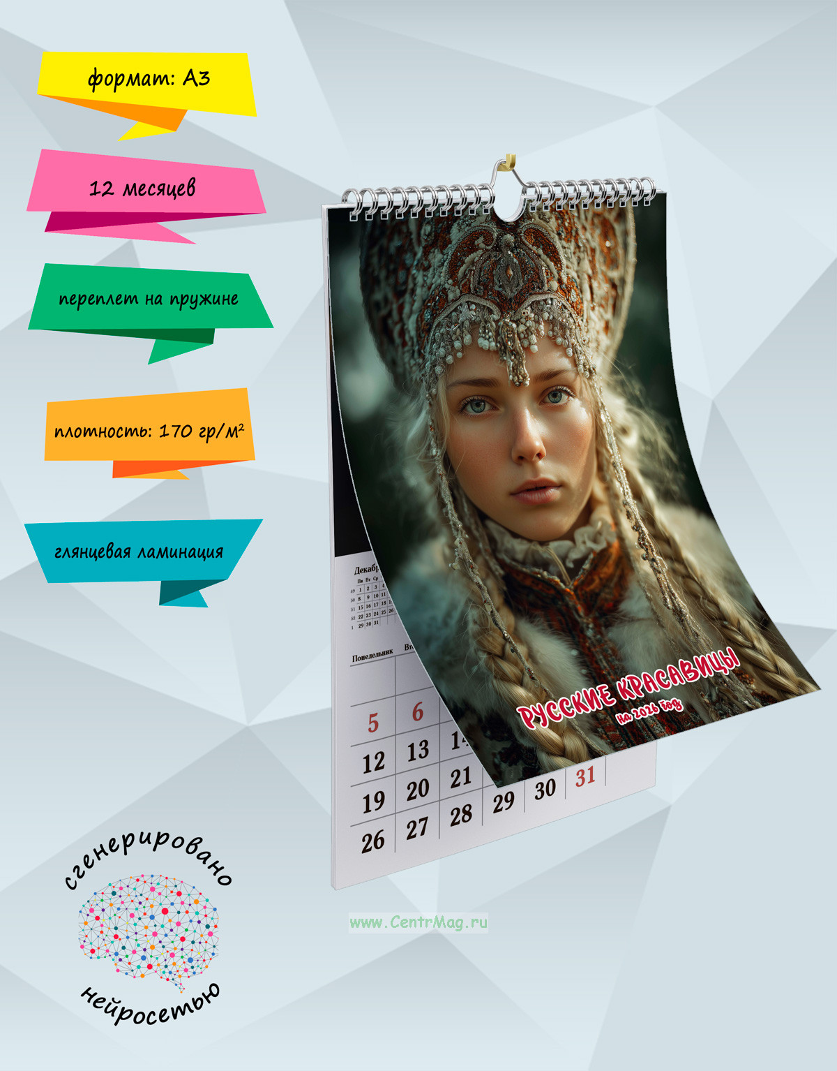 Календарь содержит изображения прекрасных русских девушек, украшенных традиционными кокошниками, сгенерированные с помощью нейросети. Календарь будет отличным подарком для ваших родных, друзей, знакомых, коллег или даже для себя.