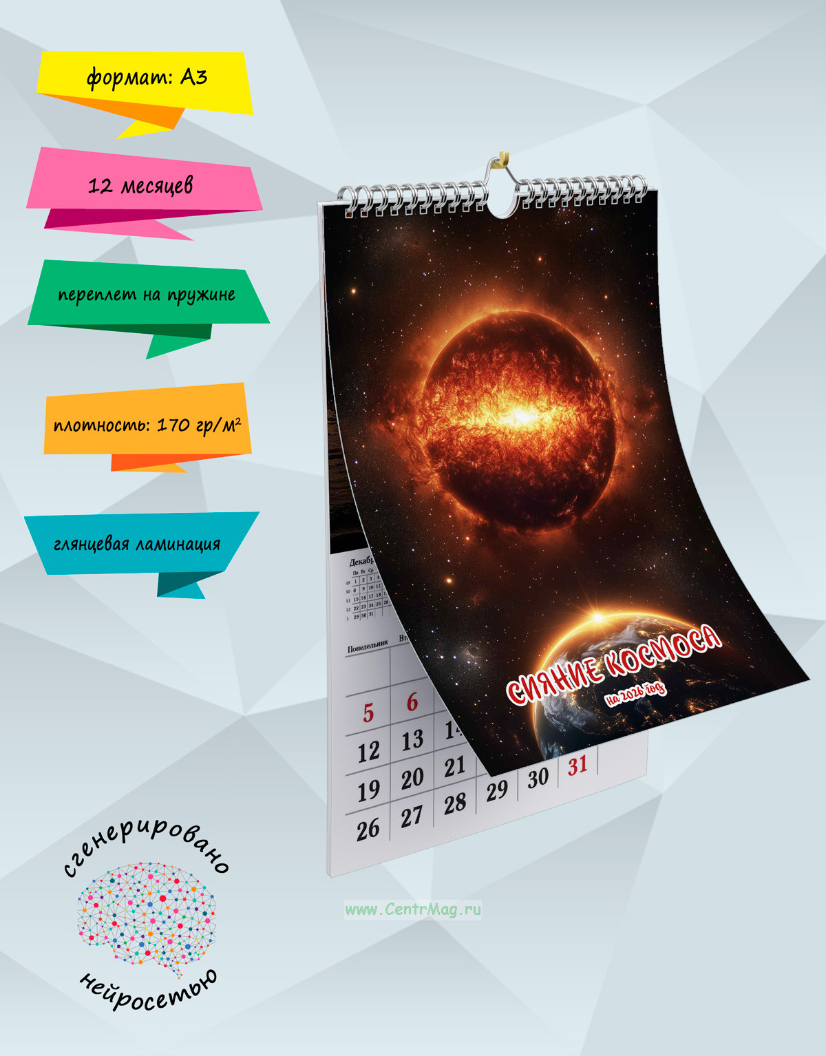 Календарь содержит завораживающие кадры космоса, сгенерированные с помощью нейросети. Календарь будет отличным подарком для ваших родных, друзей, знакомых, коллег или даже для себя.