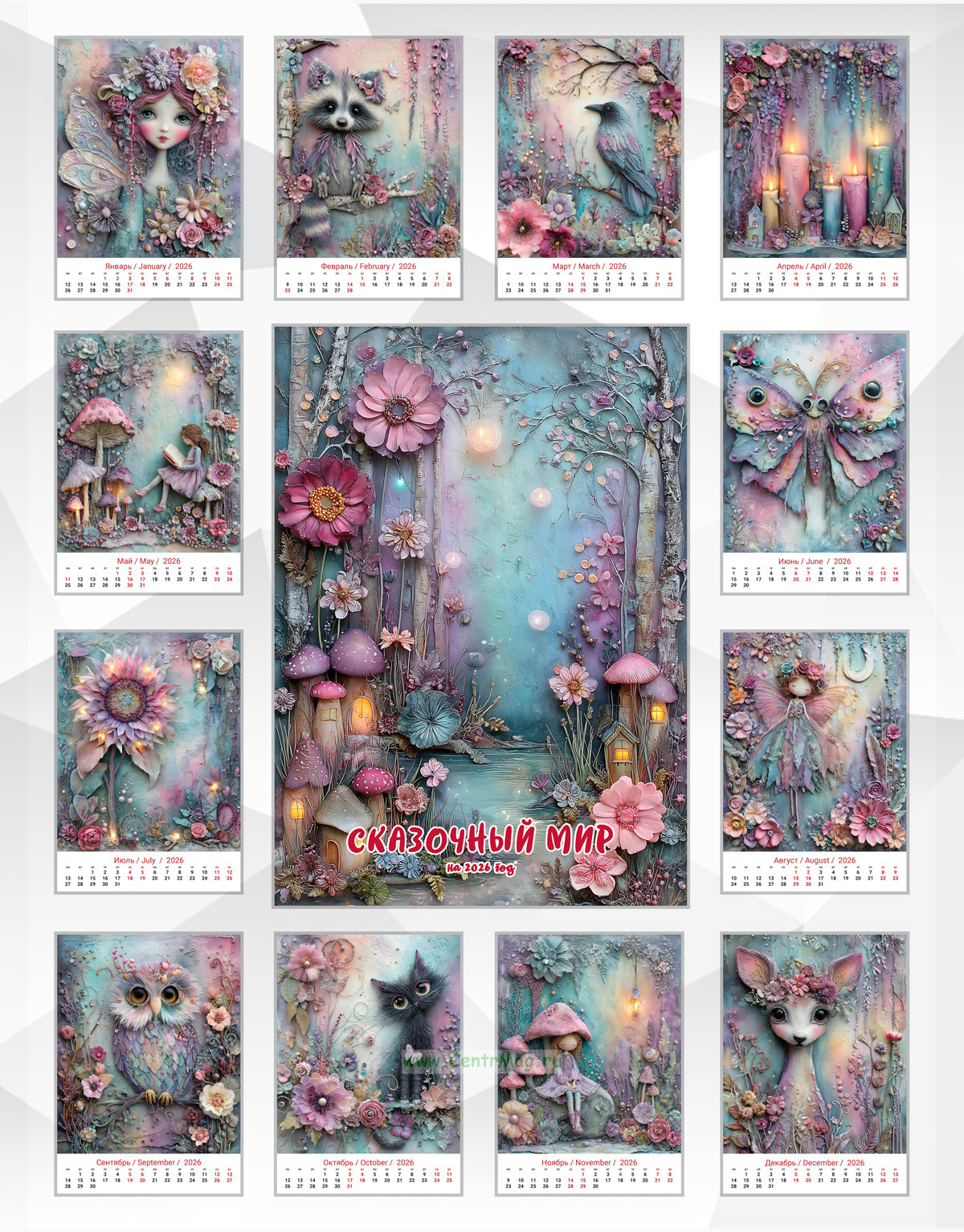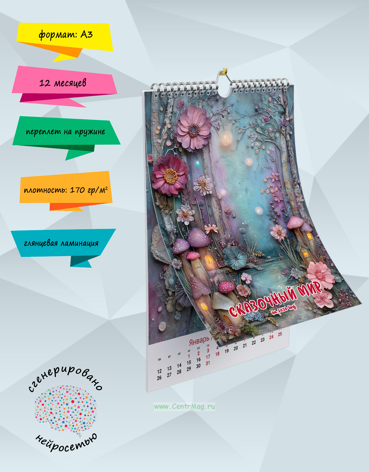 Календарь содержит текстурные изображения сказочного мира, сгенерированные с помощью нейросети. Календарь будет отличным подарком для ваших родных, друзей, знакомых, коллег или даже для себя.
