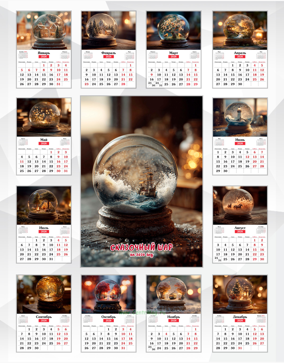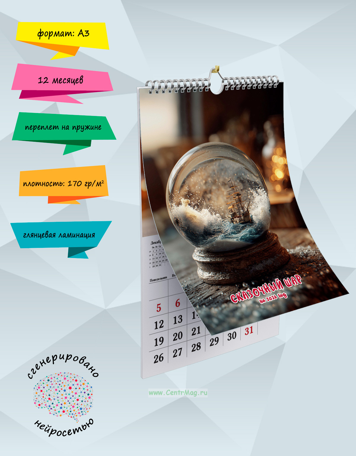 Календарь содержит изображения волшебных стеклянных шаров с миниатюрными сказочными сценами внутри, сгенерированные с помощью нейросети. Календарь будет отличным подарком для ваших родных, друзей, знакомых, коллег или даже для себя.