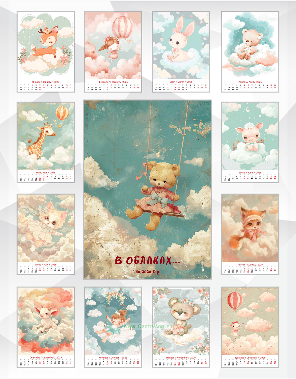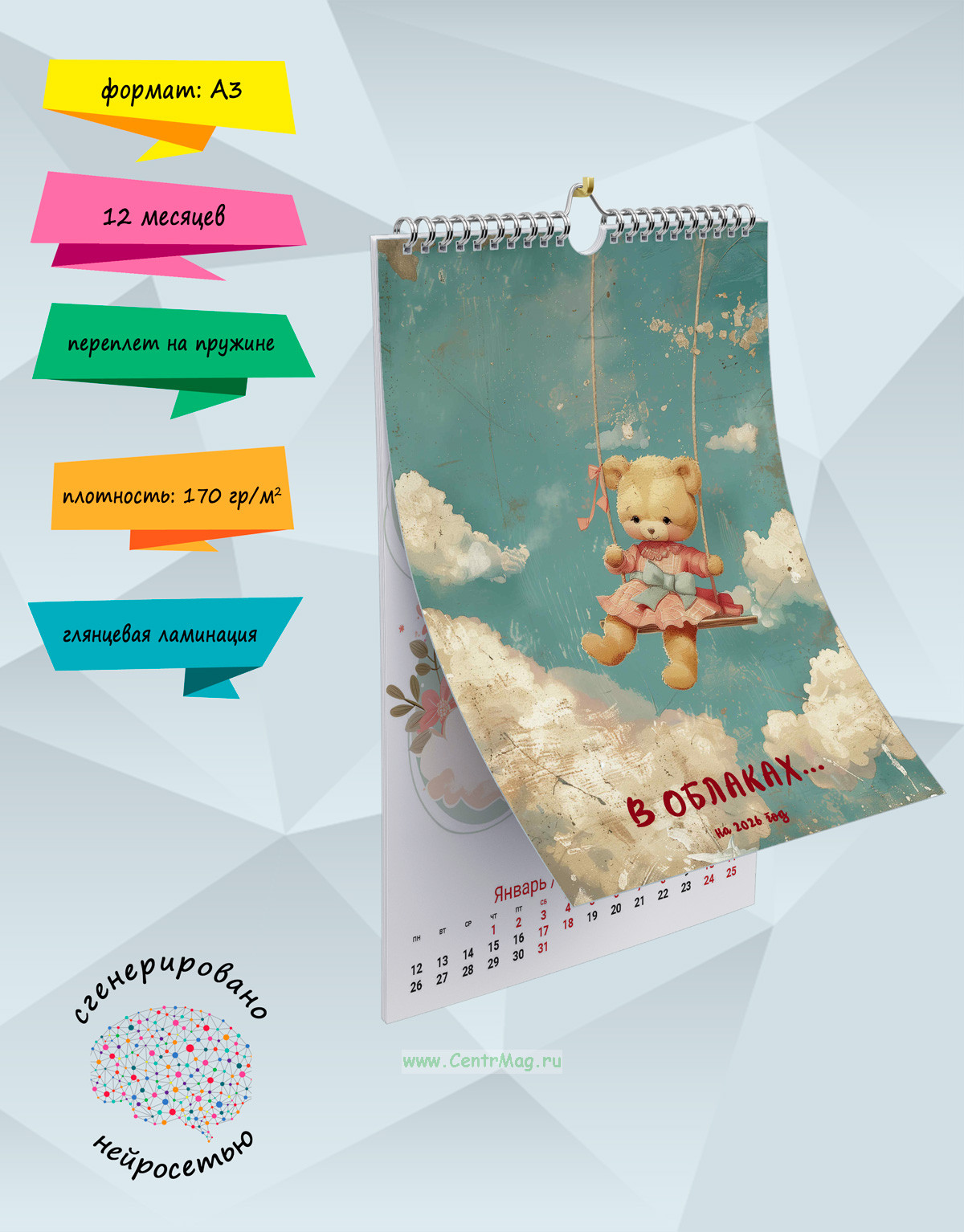 Календарь содержит очень милые изображения мультяшных персонажей, сгенерированные с помощью нейросети, которые играют в облачках. Календарь будет отличным подарком для ваших родных, друзей, знакомых, коллег или даже для себя.