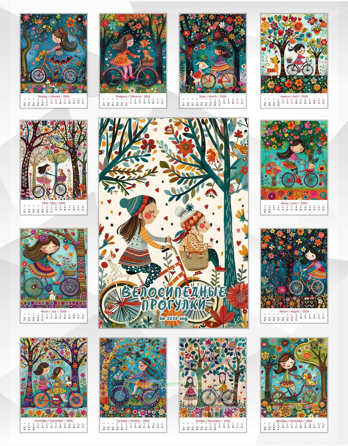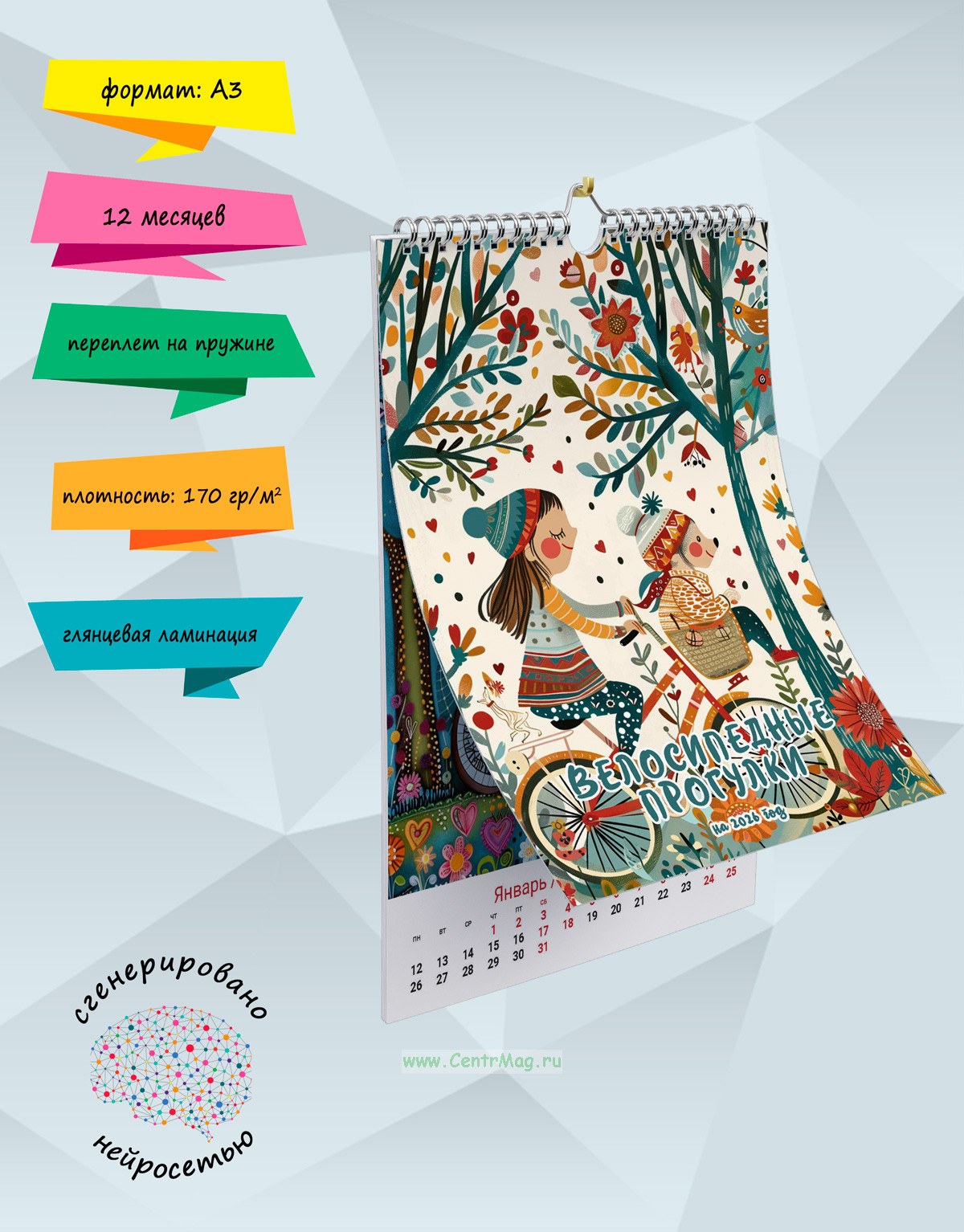 Календарь содержит изображения интересных зарисовок на тему велосипедных прогулок, сгенерированные с помощью нейросети. Календарь будет отличным подарком для ваших родных, друзей, знакомых, коллег или даже для себя.