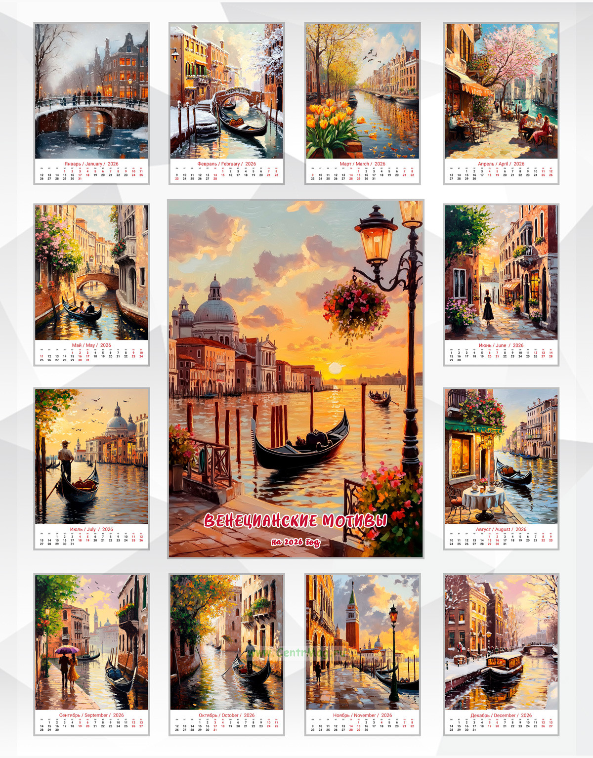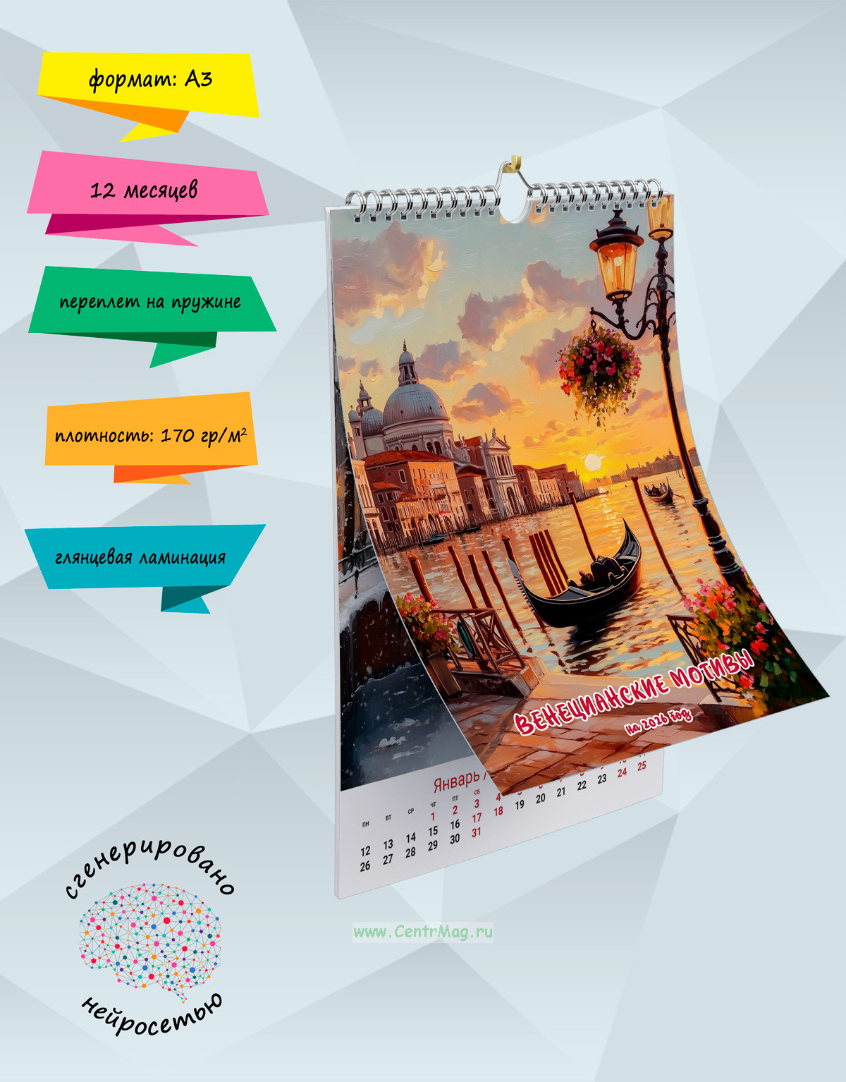 Календарь содержит красивые видовые иллюстрации Венеции, сгенерированных с помощью нейросети. Календарь будет отличным подарком для ваших родных, друзей, знакомых, коллег или даже для себя.