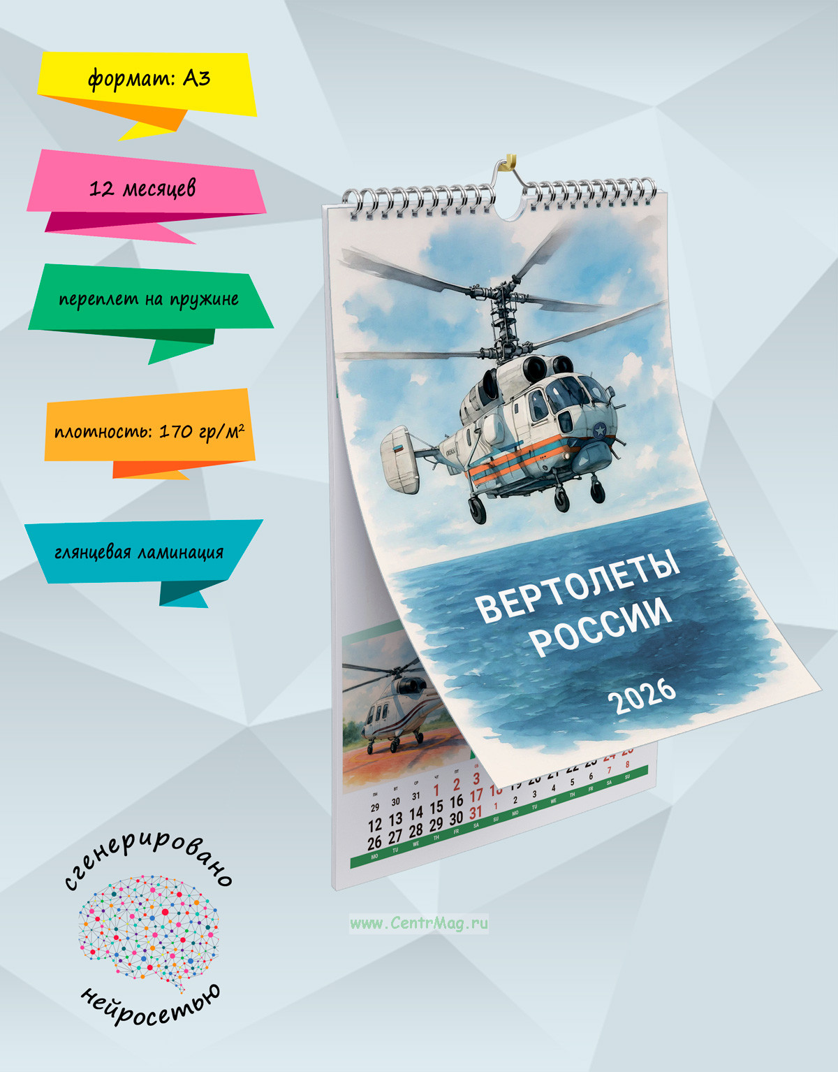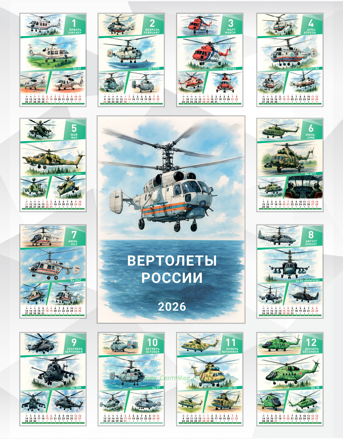 В календаре представлены изображения вертолетов: