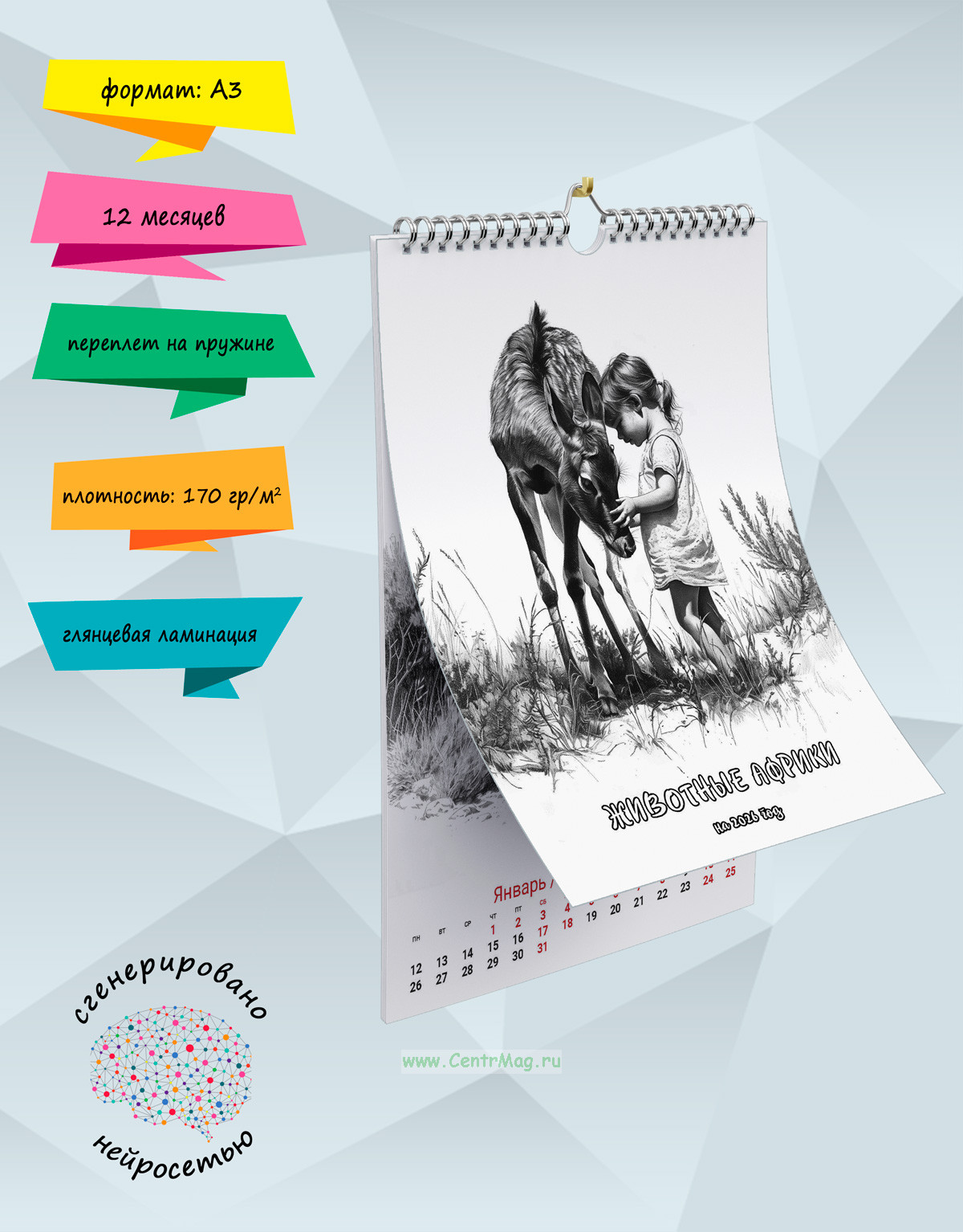 Календарь содержит изображения на тему взаимоотношений человека и животных, сгенерированные с помощью нейросети. Календарь будет отличным подарком для ваших родных, друзей, знакомых, коллег или даже для себя.