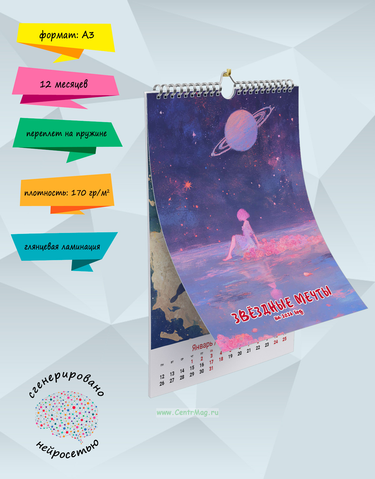 Календарь содержит изображения на тему завораживающие звезды, сгенерированные с помощью нейросети, которые дарят ласку своим детишкам. Календарь будет отличным подарком для ваших родных, друзей, знакомых, коллег или даже для себя.