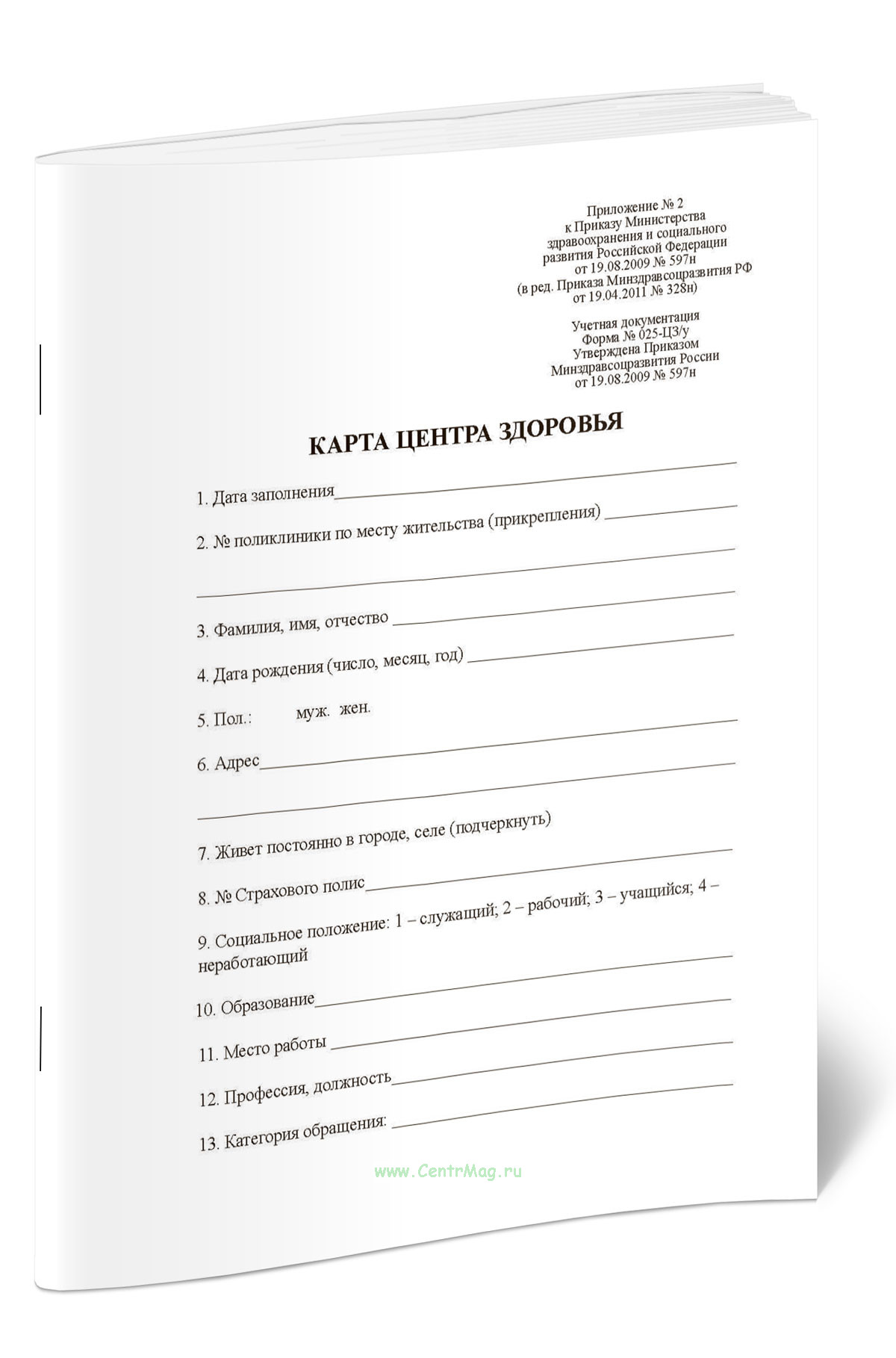 Форма карты соответствует Приложению 2 к Приказу Минздравсоцразвития России от 19.08.2009 N 597н "Об организации деятельности центров здоровья по формированию здорового образа жизни у граждан Российской Федерации, включая сокращение потребления алкоголя и табака".