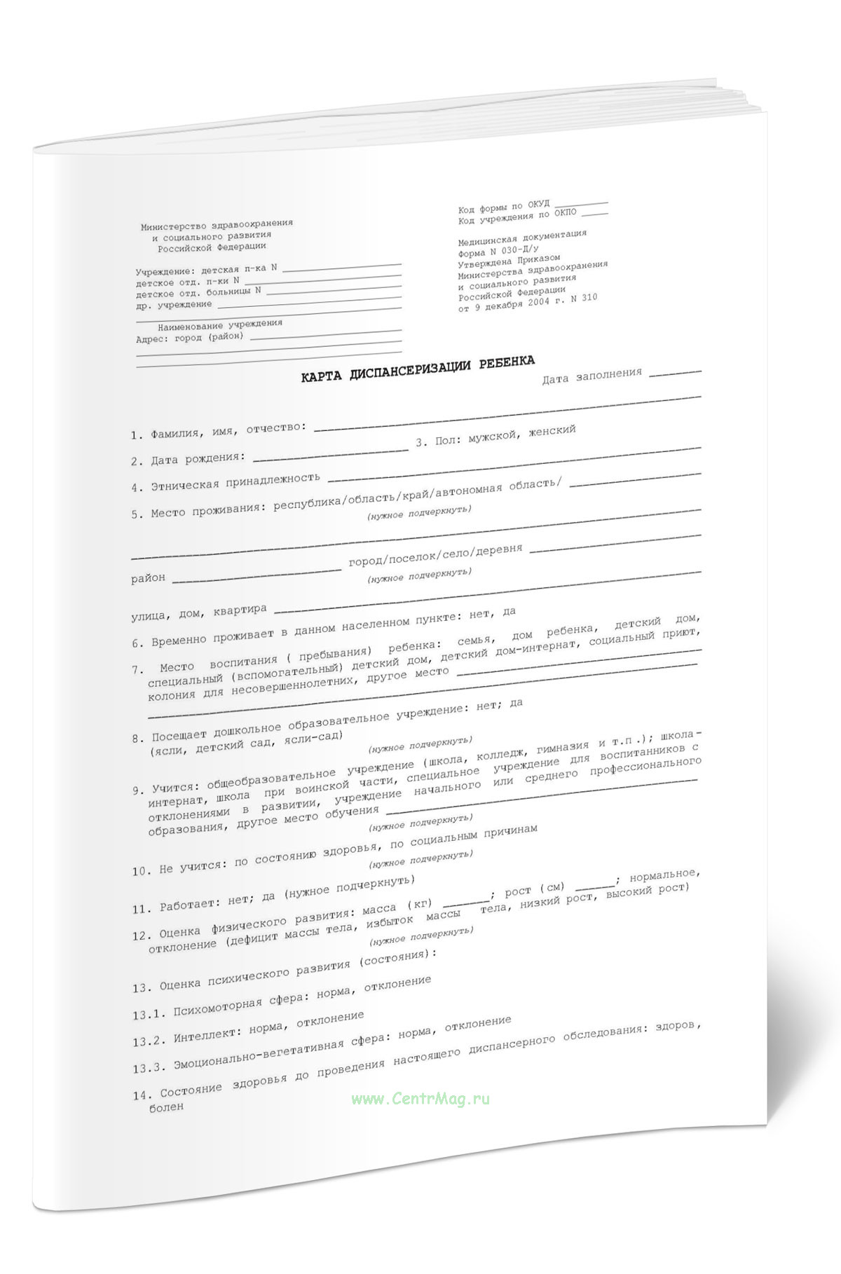 По результатам проведения диспансерного обследования на ребенка заполняется Карта диспансеризации (Форма № 030-Д/У).
