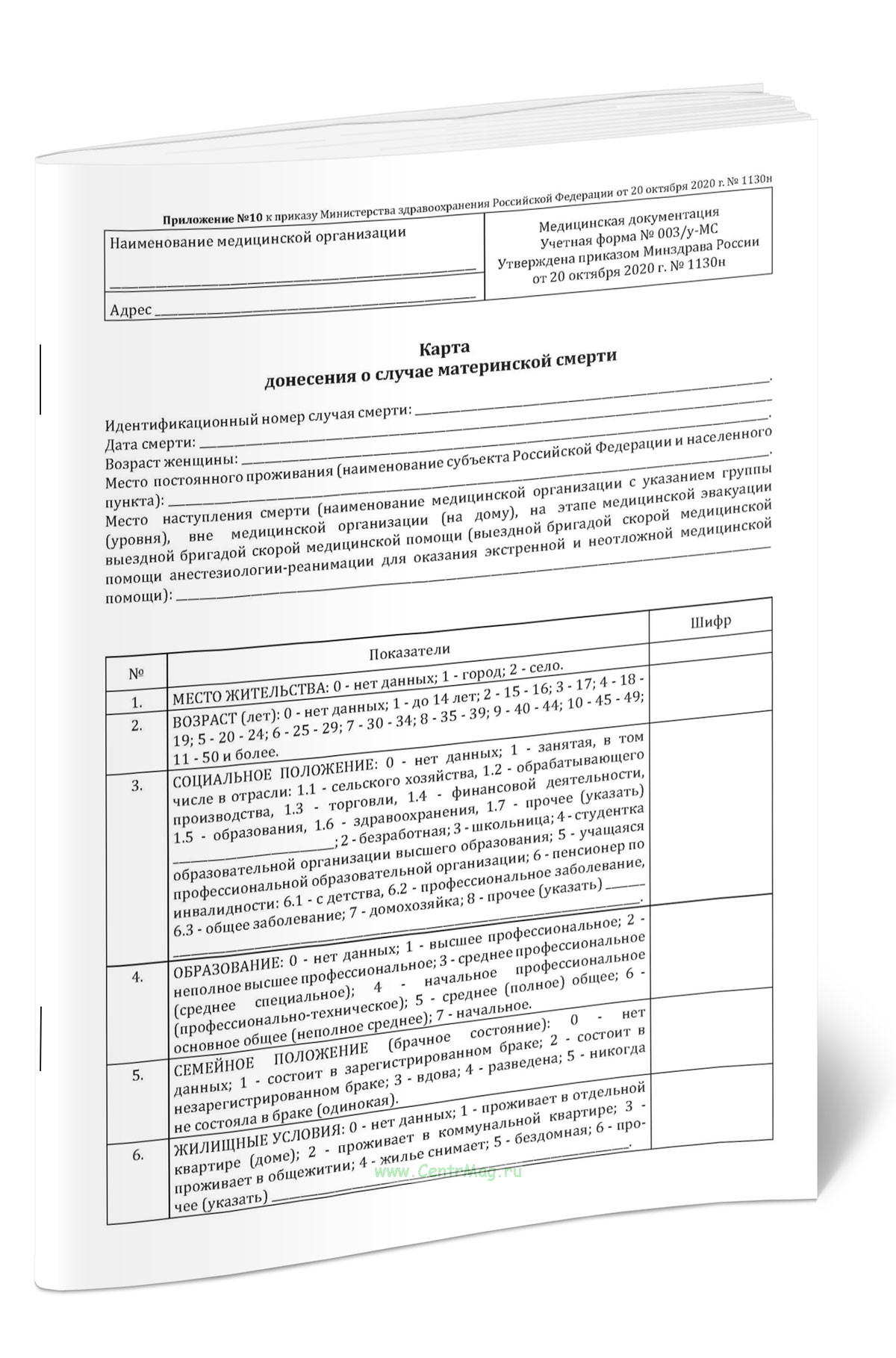Форма карты донесения о случае материнской смерти (Форма N 003/у-МС) соответствует Приложению №10 к Приказу Минздрава России от 20.10.2020 N 1130н "Об утверждении Порядка оказания медицинской помощи по профилю "акушерство и гинекология".