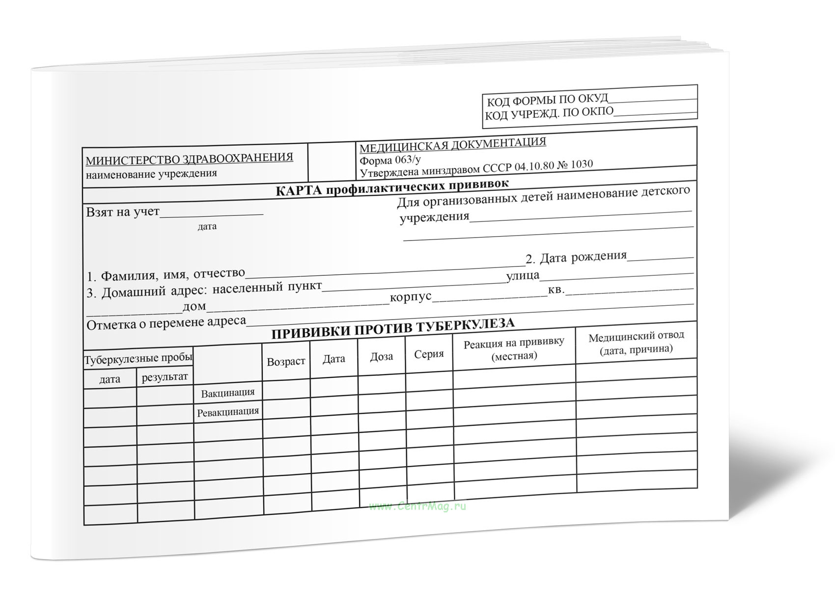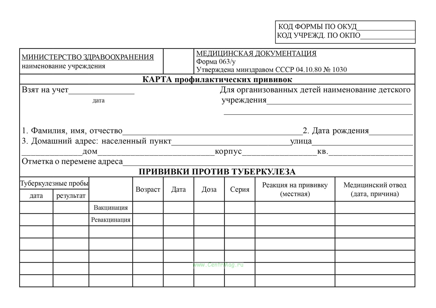 Форма карты профилактических прививок,форма 063/у, утверждена Приказом Минздрава СССР №1030 «Об утверждении форм первичной медицинской документации учреждений здравоохранения» от 4 октября 1980 г., который утратил силу.