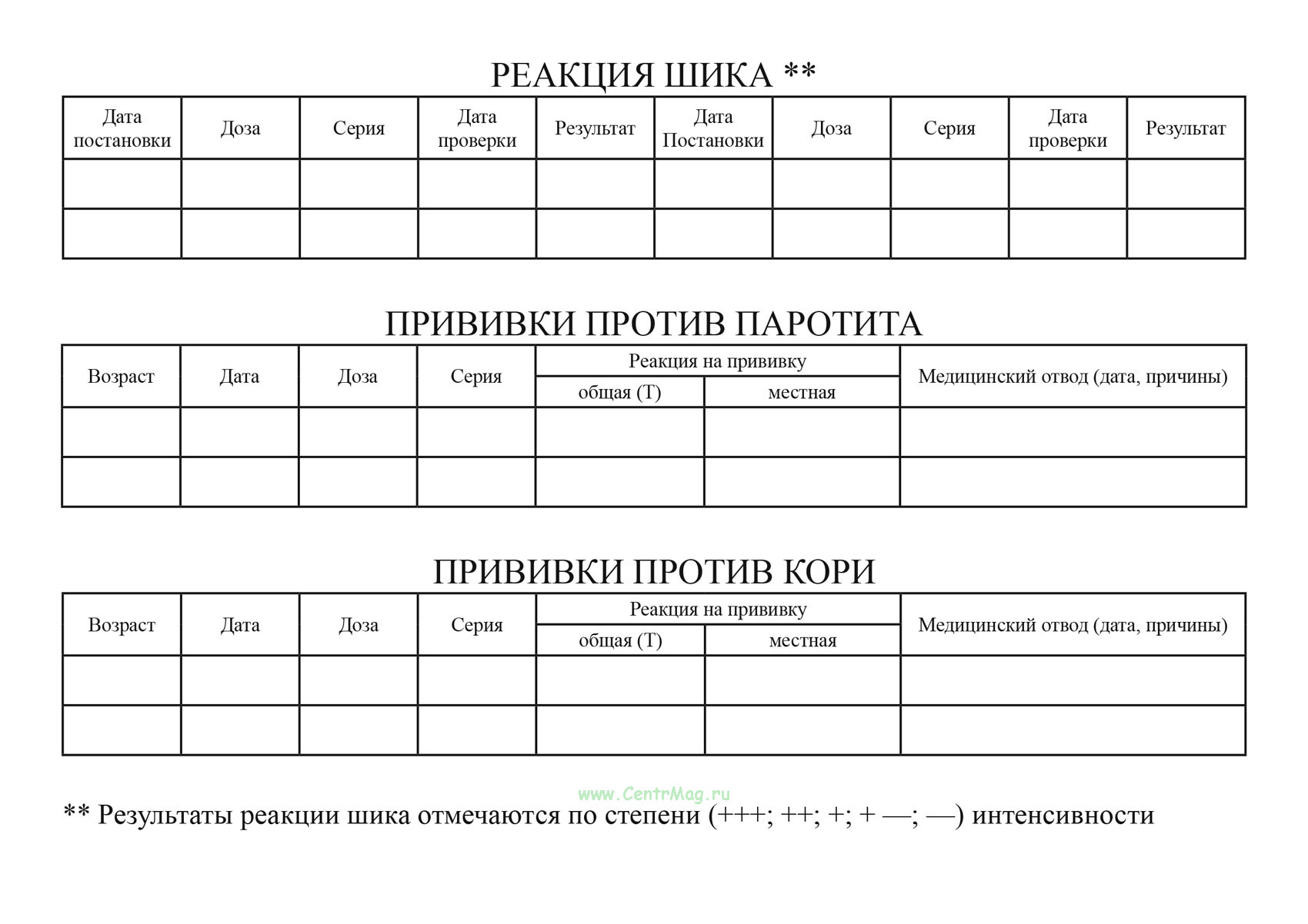 Карта профилактических прививок (Форма 063/у) - официальный учетный документ для фиксации сведений о вакцинации: дат, серий и наименований вакцин, реакций, медотводов и ревакцинаций. Формат A5, 2 листа с оборотом. Ведётся во всех медорганизациях, а также в дошкольных учреждениях и школах, где проводятся прививки; заполняется на каждого новорождённого и каждого вновь поступившего под наблюдение поликлиники или ФАПа. Карты хранятся в специальной картотеке, раскладываются по месяцам следующей прививки для ежемесячного учёта; при наличии централизованной картотеки в ДДУ/школах медсёстры получают ежемесячные списки детей, подлежащих вакцинации, переносят данные в карту и отчитываются, при отсутствии централизованной картотеки планирование выполняют сотрудники поликлиники/учреждения. При выезде ребёнка из города (района) выдаётся справка о проведённых прививках; сама карта остаётся в медучреждении или ФАПе и хранится в архиве 5 лет. Данные карт используются для составления отчёта о профилактических прививках (ф. № 86-леч) . Подходит государственным и частным медорганизациям; используется педиатрами, терапевтами, иммунологами, участковыми и процедурными медсёстрами; применяется в поликлиниках, прививочных кабинетах, ФАПах, школах, детсадах и мобильных пунктах вакцинации.