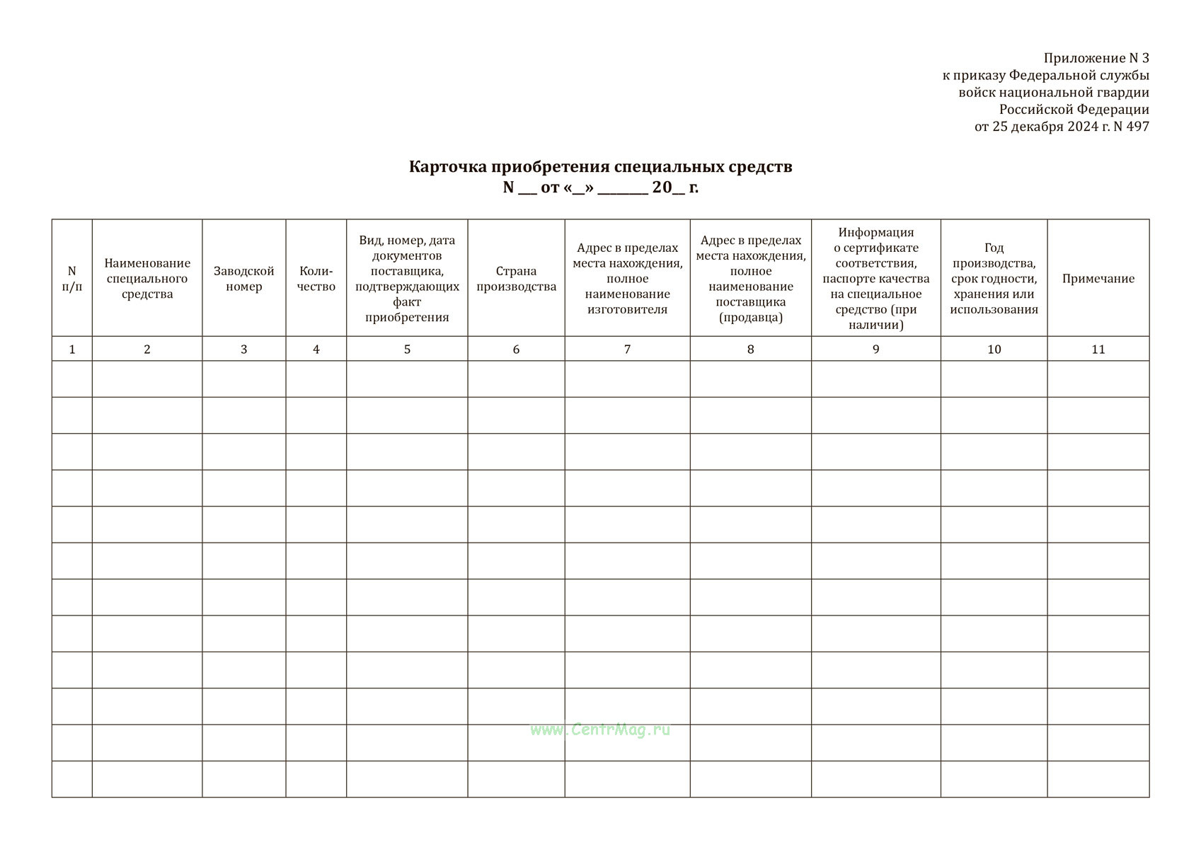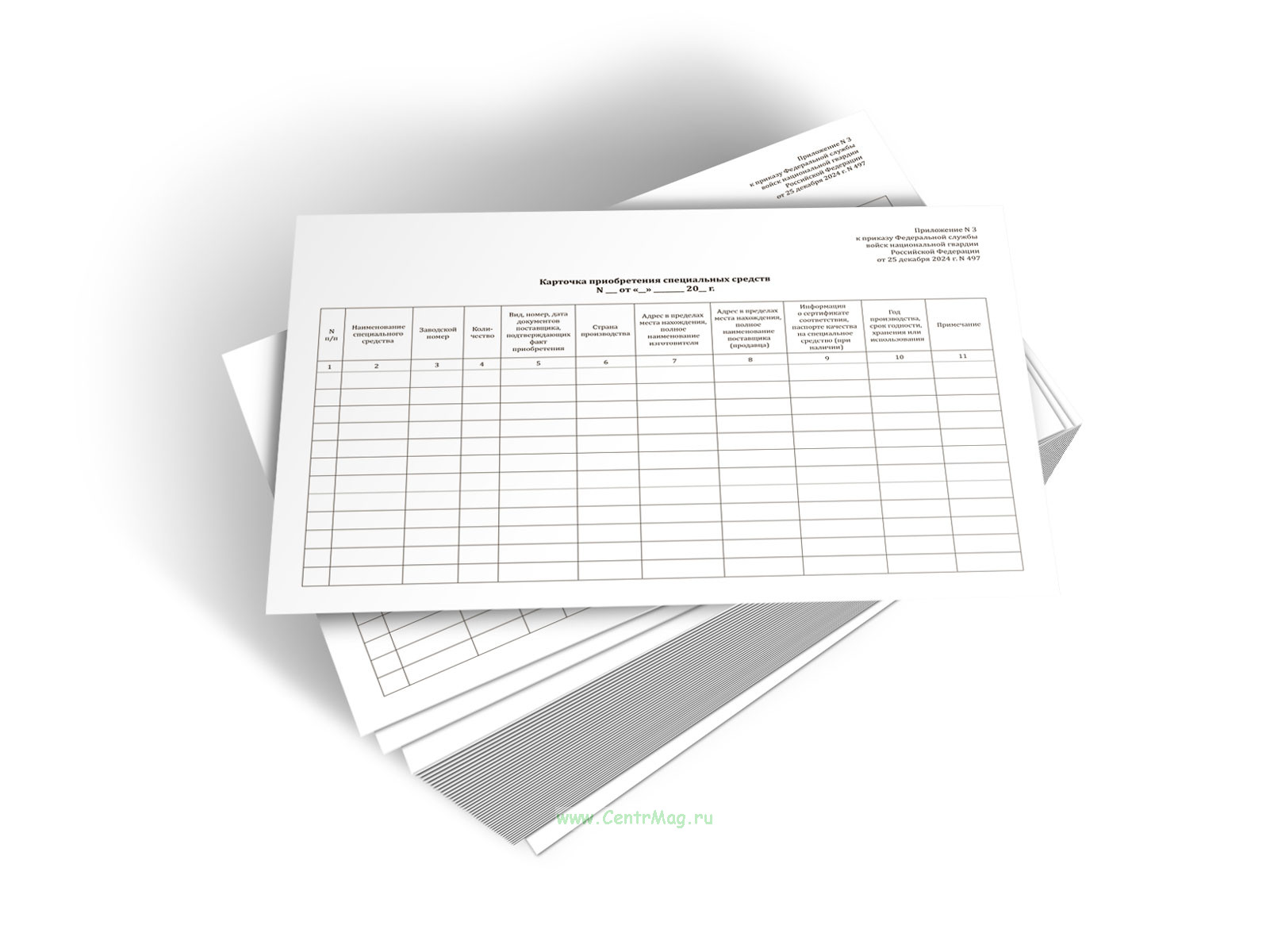 Форма Карточки приобретения специальных средств соответствует Приложению № 3 к Приказу Росгвардии от 25.12.2024 N 497 "Об утверждении перечней, форм и порядков ведения документов, оформляемых ведомственной охраной федеральных государственных органов, федеральных органов исполнительной власти, высшего исполнительного органа субъекта Российской Федерации - города федерального значения Москвы, организаций, имеющих в соответствии с законодательством Российской Федерации право на создание ведомственной охраны, при приобретении, учете, передаче (возврате) специальных средств, а также публичным акционерным обществом "Сбербанк России" при передаче специальных средств"