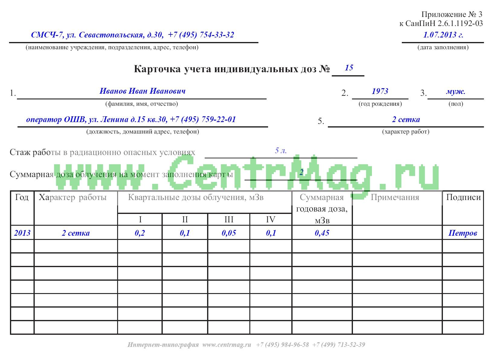 Форма карточки учета индивидуальных доз соответствует Приложению № 3 к СанПиН 2.6.1.1192-03.
