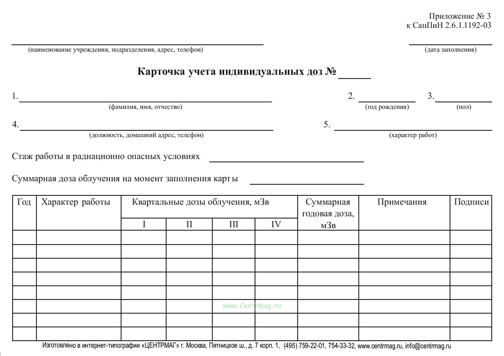 Форма карточки учета индивидуальных доз соответствует Приложению № 3 к СанПиН 2.6.1.1192-03.