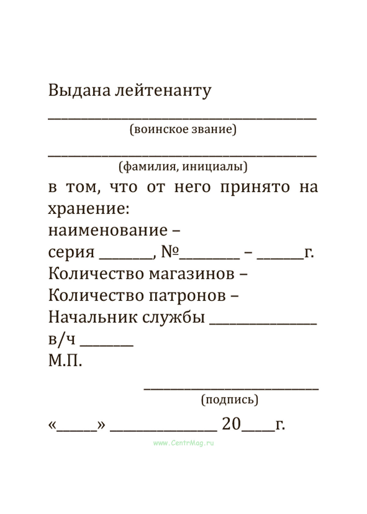 Каждая запись о выдаче и сдаче оружия заверяется подписью командира подразделения и гербовой печатью воинской части.