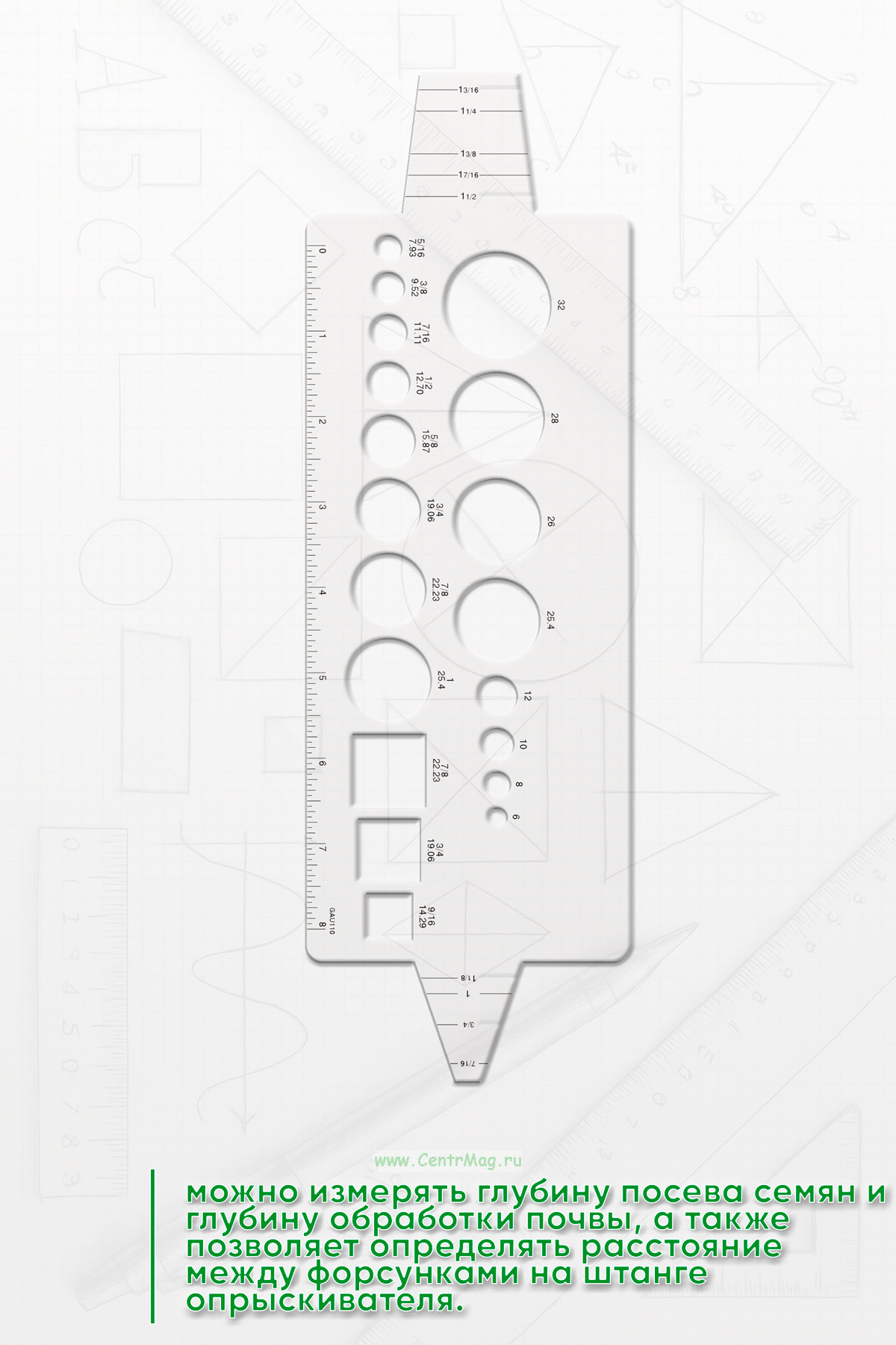 Линейка представляет собой специализированный инструмент, предназначенный для выполнения агрономических работ и точных измерений в сельском хозяйстве. С помощью такой линейки можно измерять глубину посева семян и глубину обработки почвы, а также позволяет определять расстояние между форсунками на штанге опрыскивателя.