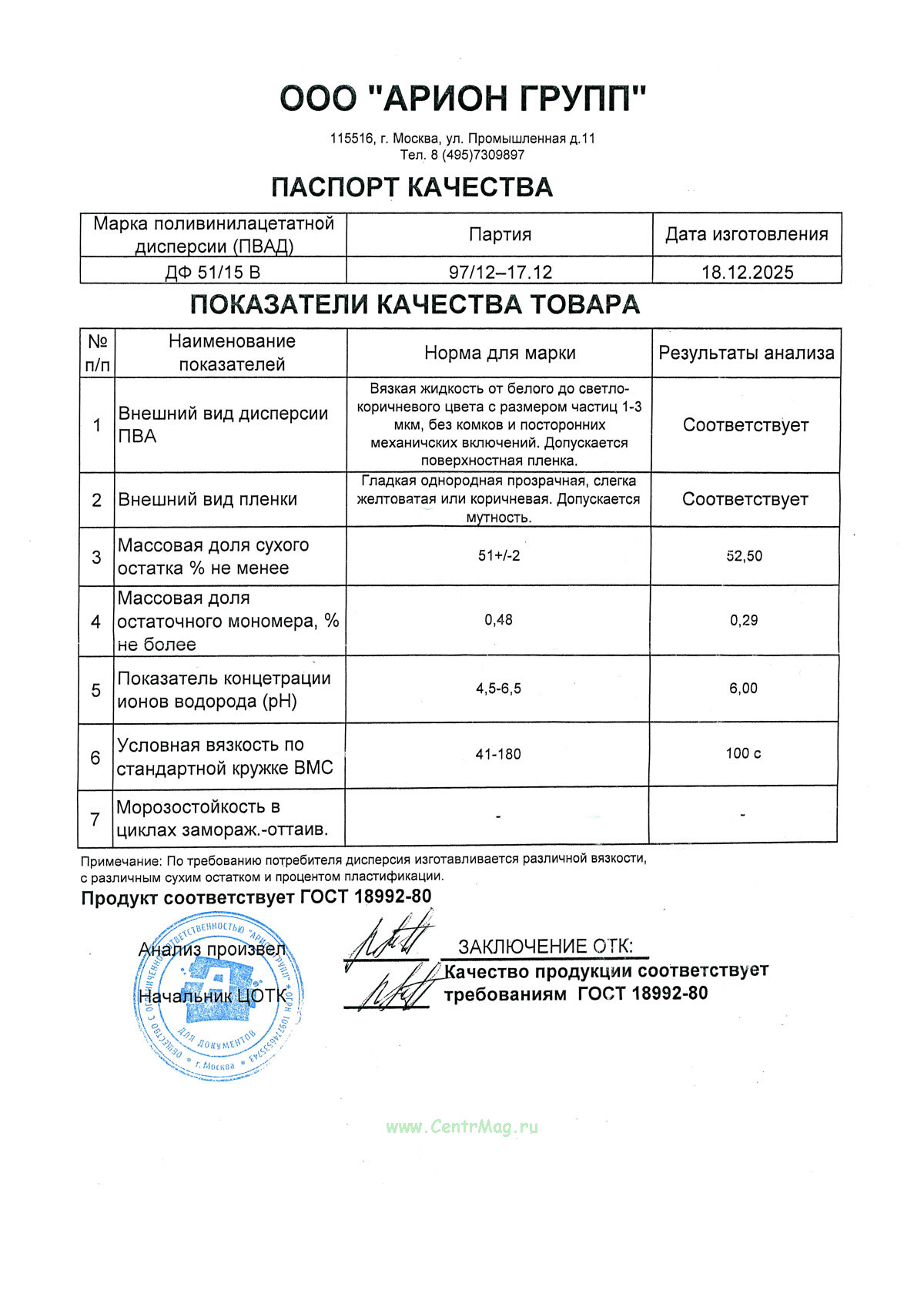 Поливинилацетатная дисперсия ДФ 51/15В – высоковязкая, гомополимерная, грубодисперсная, пластифицированная дибутилфталатом, стабилизированная поливиниловым спиртом. Соответствует ГОСТ 18992-80