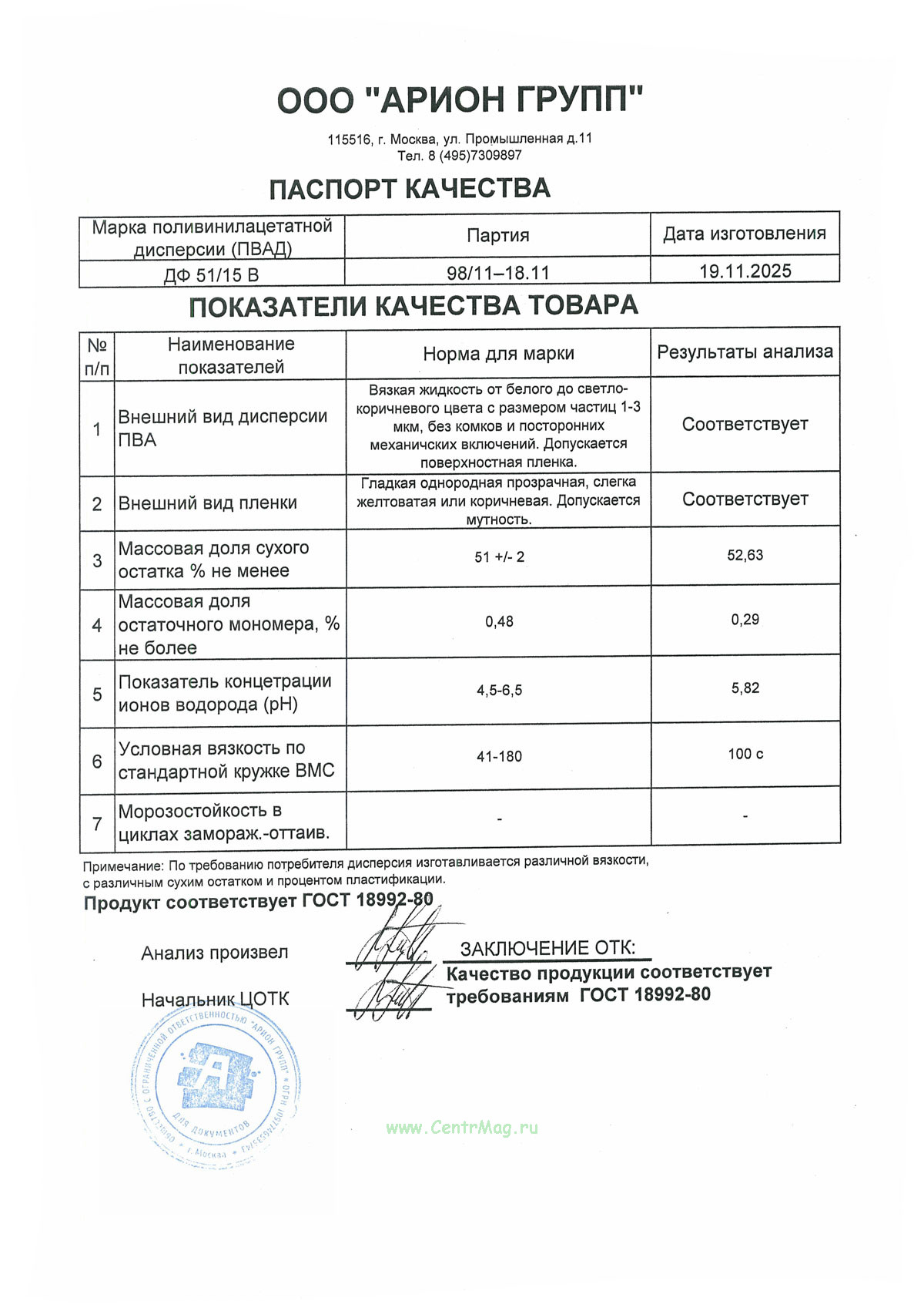 Поливинилацетатная дисперсия ДФ 51/15В – высоковязкая, гомополимерная, грубодисперсная, пластифицированная дибутилфталатом, стабилизированная поливиниловым спиртом. Соответствует ГОСТ 18992-80