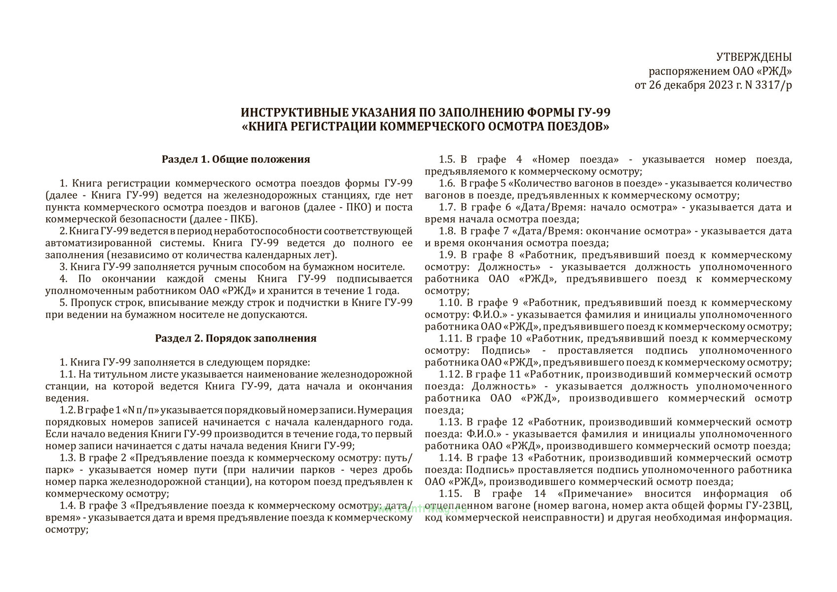 Форма Книги регистрации коммерческого осмотра поездов (ГУ-99) утверждена Распоряжением ОАО "РЖД" от 26.12.2023 N 3317/р