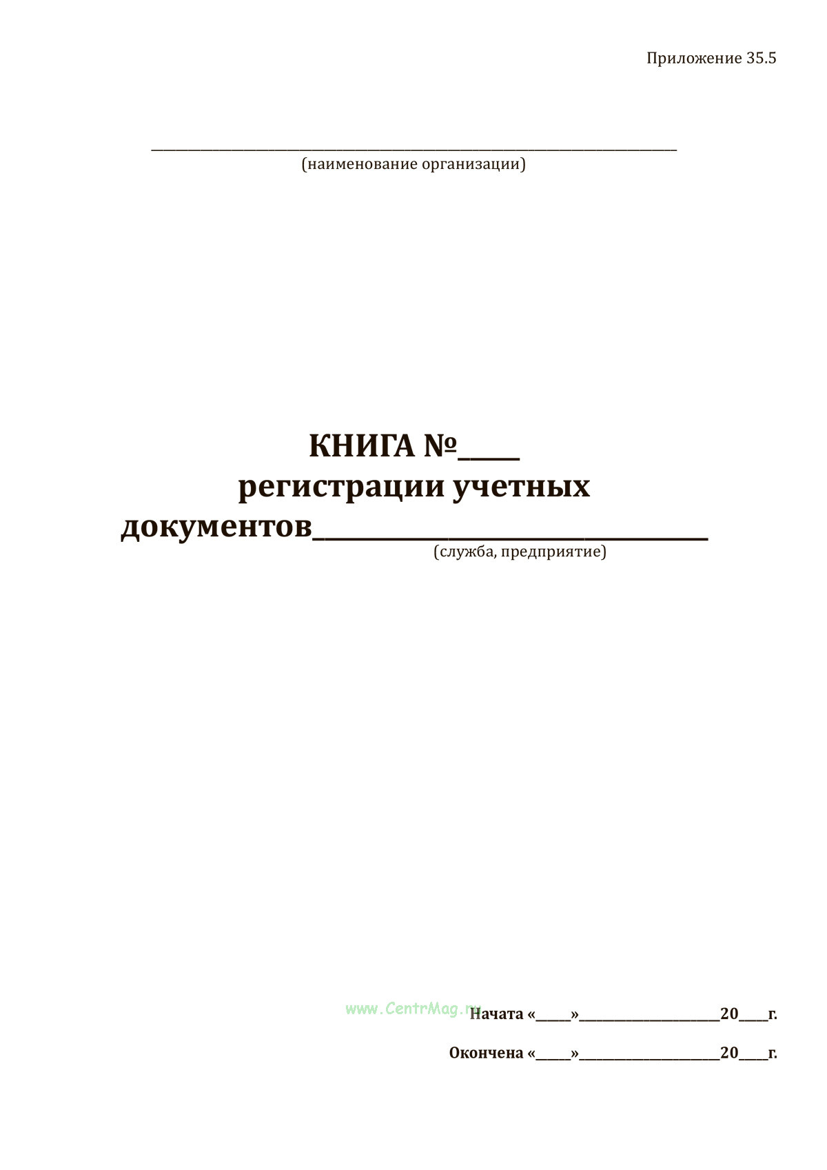 Форма книги регистрации учетных документов соответствует Приложению №35.5 к Инструкции о порядке ведения учета, отчетности и расходования горюче-смазочных материалов в гражданской авиации
