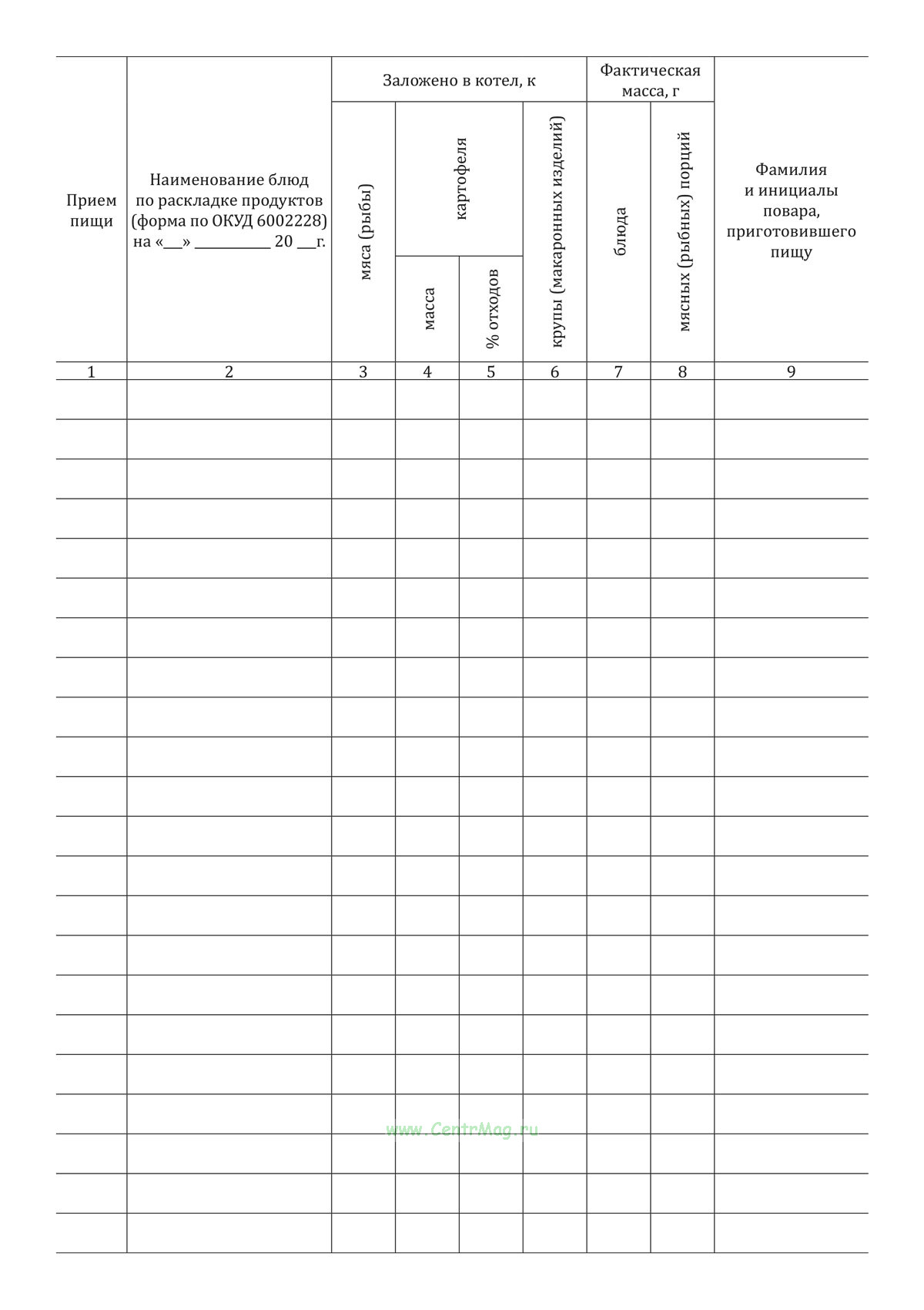 2. Наименование блюд по раскладке продуктов (форма по ОКУД 6002228) на «___» ____________ 20 ___г.