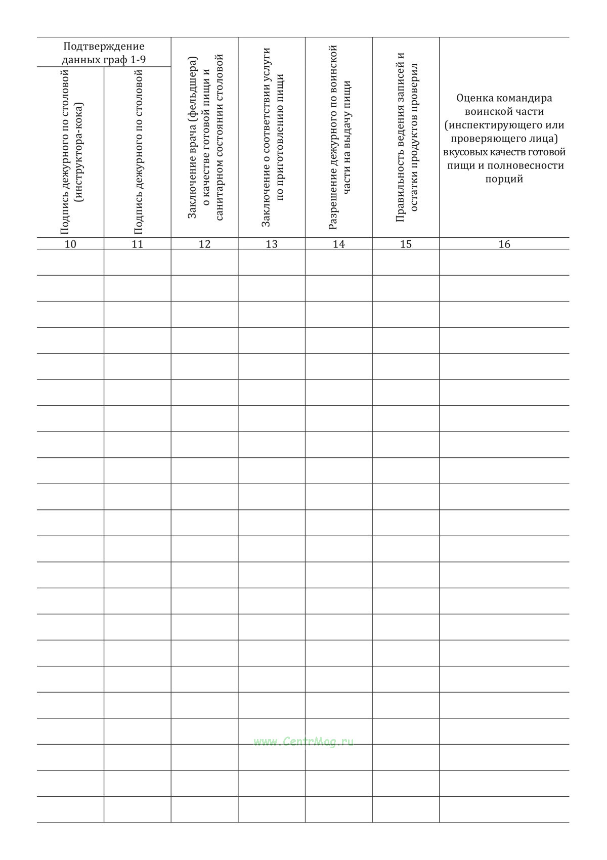 Учет продуктов, заложенных в котлы, фактического выхода готовых блюд, мясных и рыбных порций и качества приготовленной в столовой пищи (на камбузе корабля, ведущего свое хозяйство) ведется в книге учета контроля за качеством приготовления пищи.