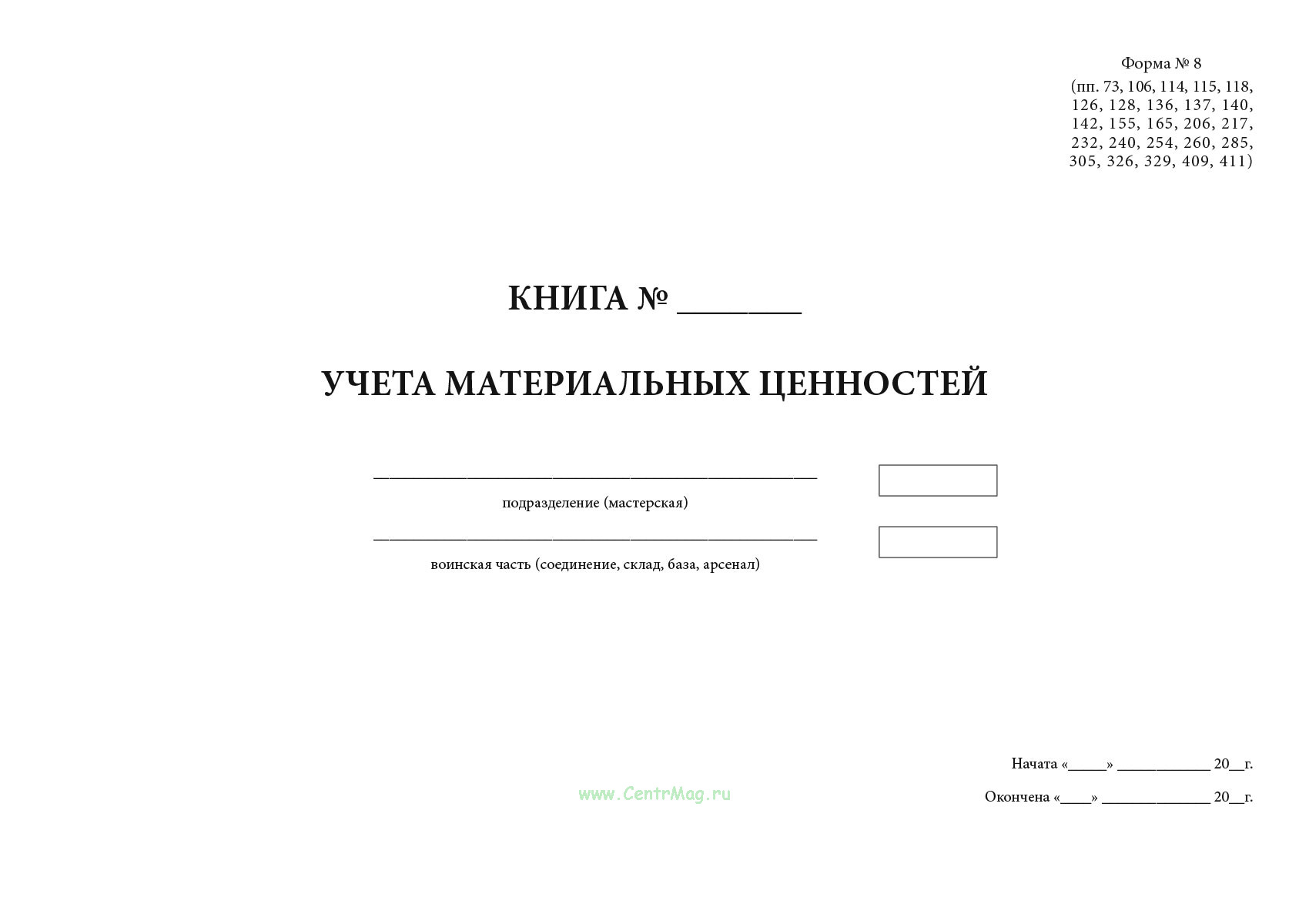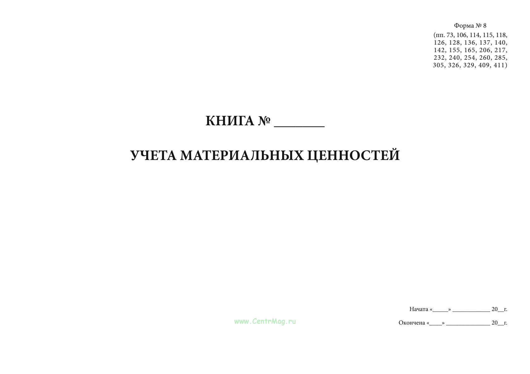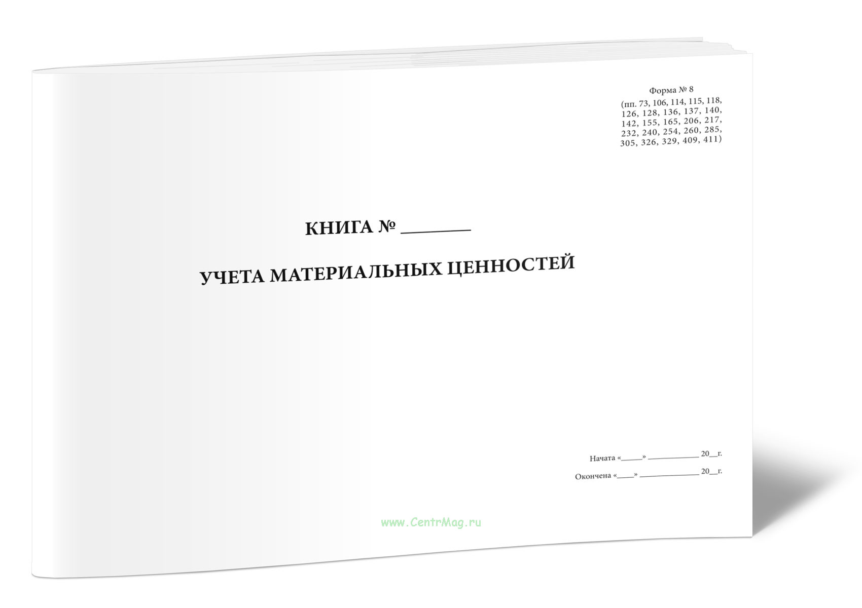 Книга учета материальных ценностей (Форма 8) предназначена для ведения учета наличия и движения товарно-материальных ценностей (ТМЦ) в организациях, на предприятиях, в учреждениях и на складах. Применяется в бухгалтерии, отделах снабжения, в хозяйственной и складской деятельности.