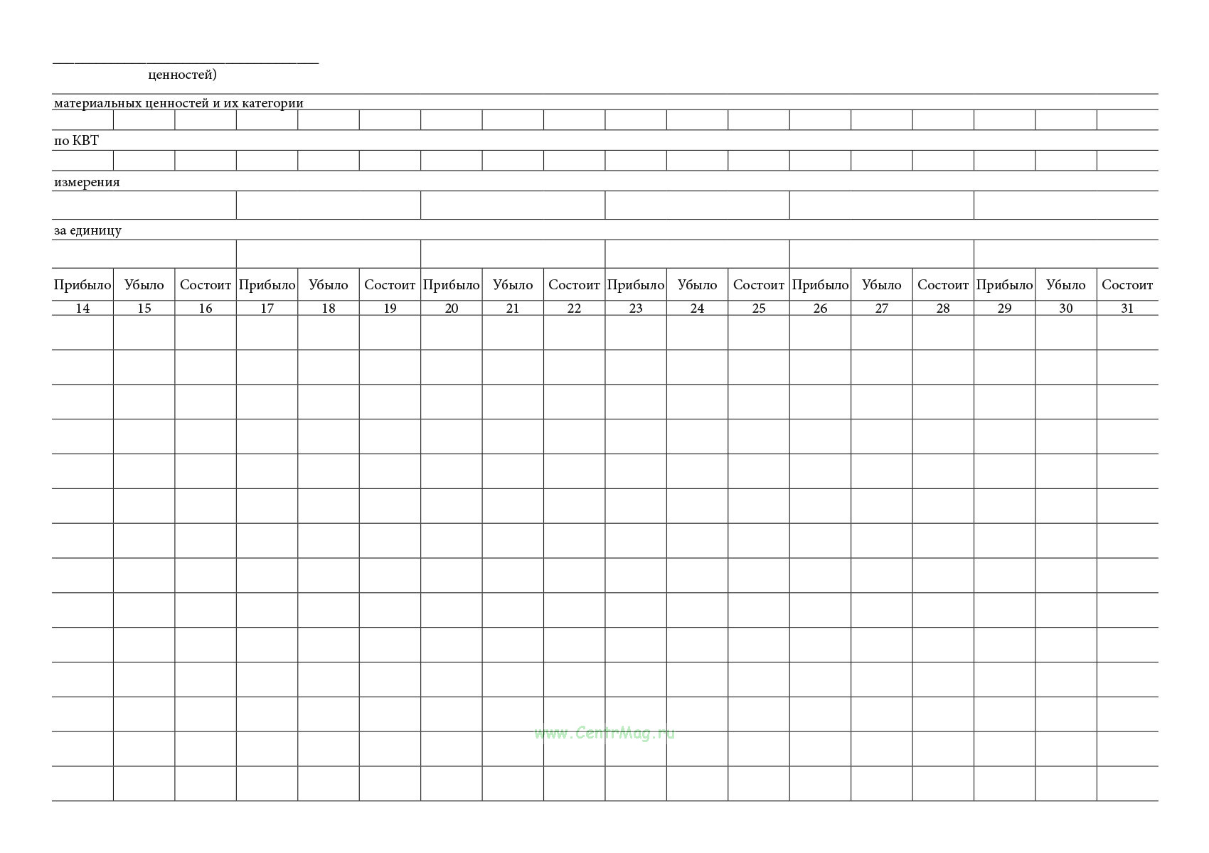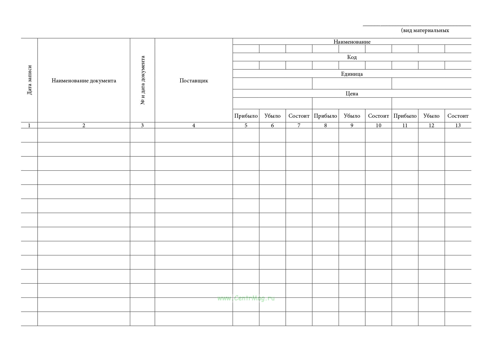 Используется для регистрации поступления, списания и остатков материальных ценностей по каждому наименованию. Каждой позиции отводится лицевой счет с ежедневными записями всех операций: приход, расход, остаток. Учет ведется по установленной типовой форме с 31 графой, включая дату, наименование документа, номер и дату, поставщика, данные по движению.