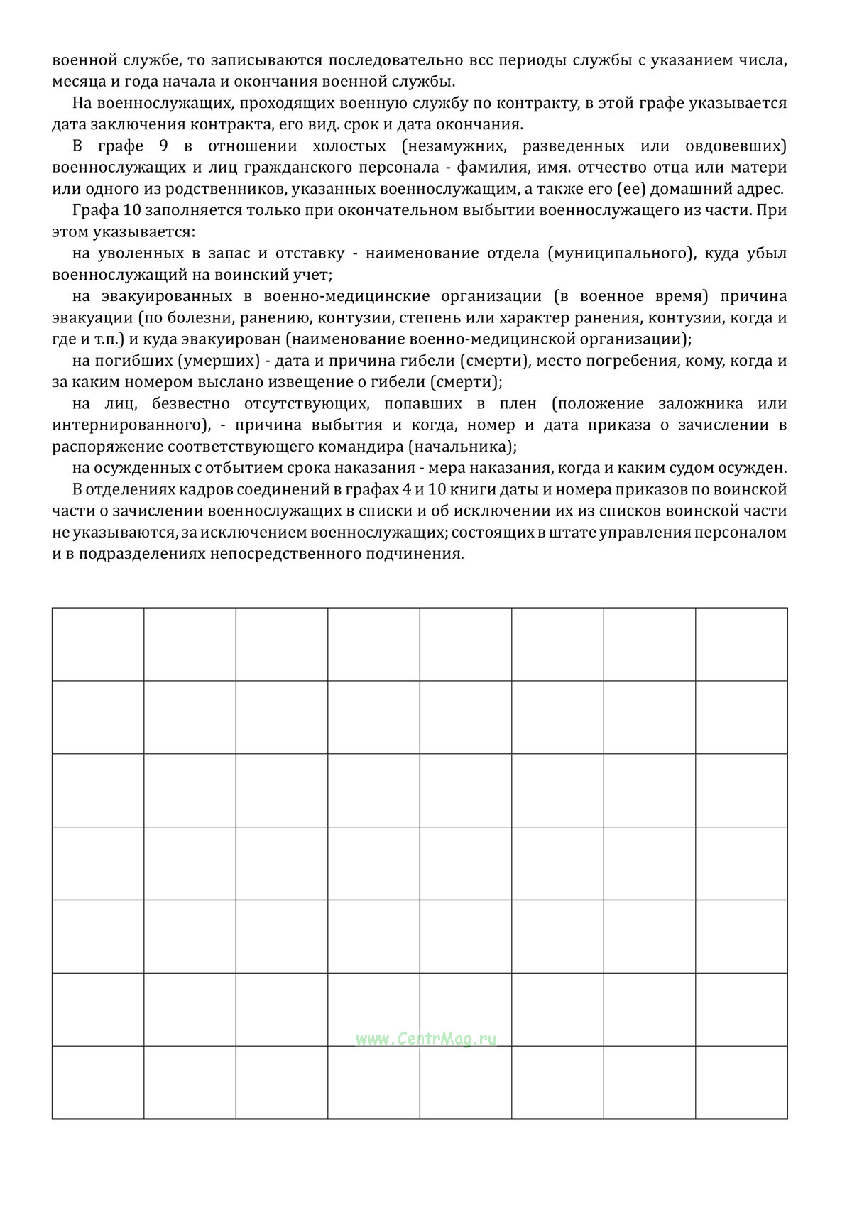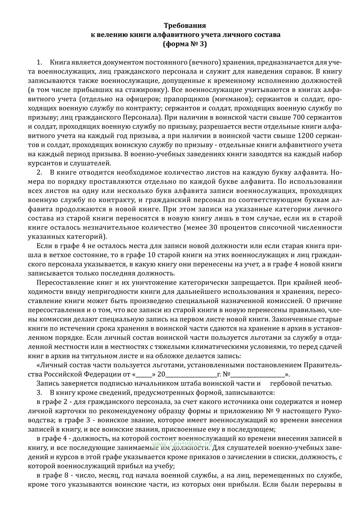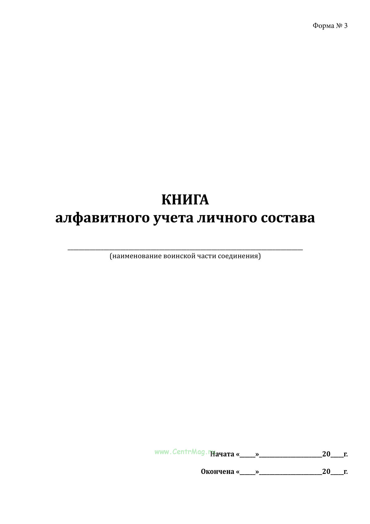 Книга является документом постоянного (вечного) хранения, предназначается для учета военнослужащих, лиц гражданского персонала и служит для наведения справок. В книгу записываются также военнослужащие, допущенные к временному исполнению должностей (в том числе прибывших на стажировку). Все военнослужащие учитываются в книгах алфавитного учета (отдельно на офицеров; прапорщиков (мичманов); сержантов и солдат, проходящих военную службу по контракту; сержантов и солдат, проходящих военную службу по призыву; лиц гражданского Персонала.