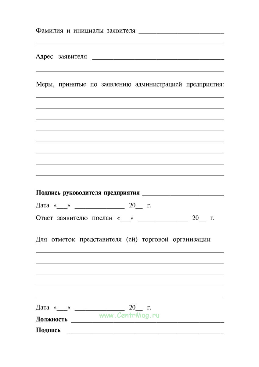 Предназначена для быстрого реагирования на нарушения в обслуживании. Принять меры по каждой жалобе потребителя администрация предприятия обязана в двухнедельный срок. Покупатель обязан оставлять свое имя и адрес.