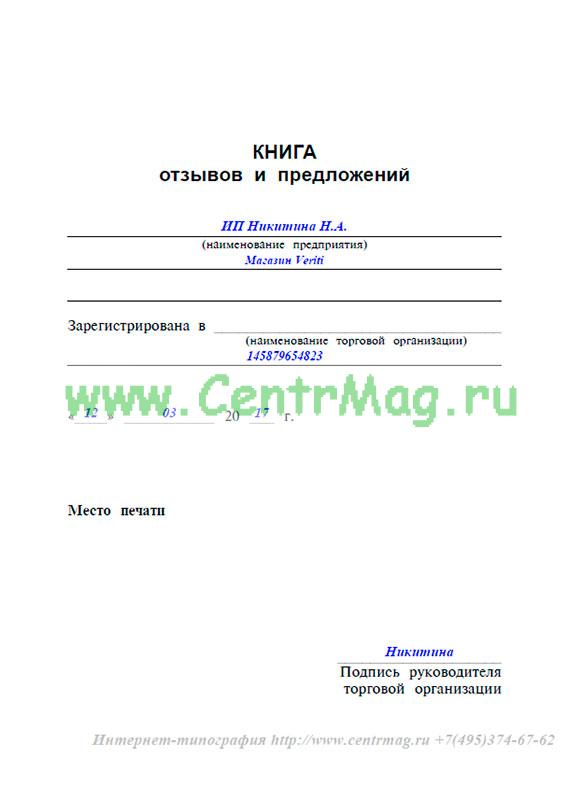 6. Изъятие книги отзывов и предложений из торгового зала для любых целей не допускается.